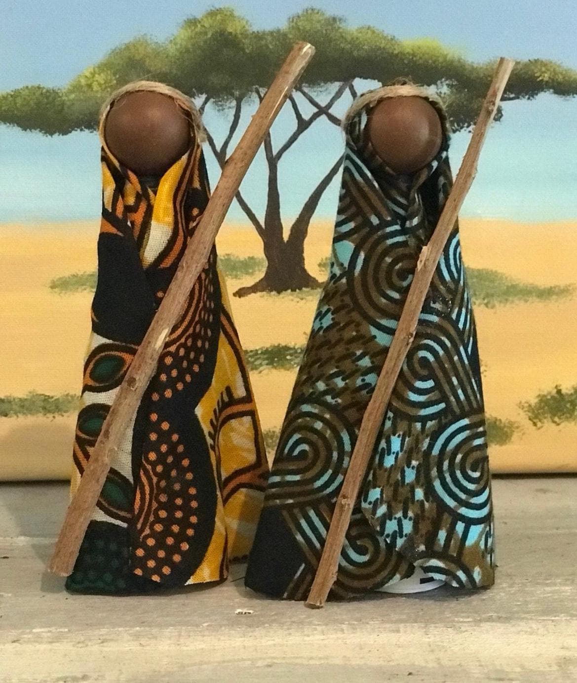Each figure is made from layers of recycled heavy paper strips coated with resin as the base, wooden heads, authentic African kitenge fabric for clothing, twine for headgear and recycled sticks and wood for gifts and staffs. They are durably constructed.