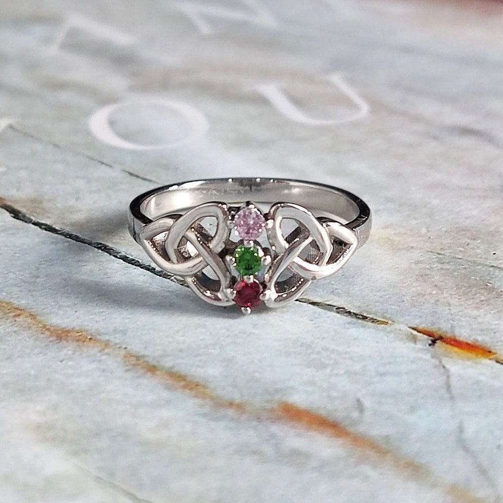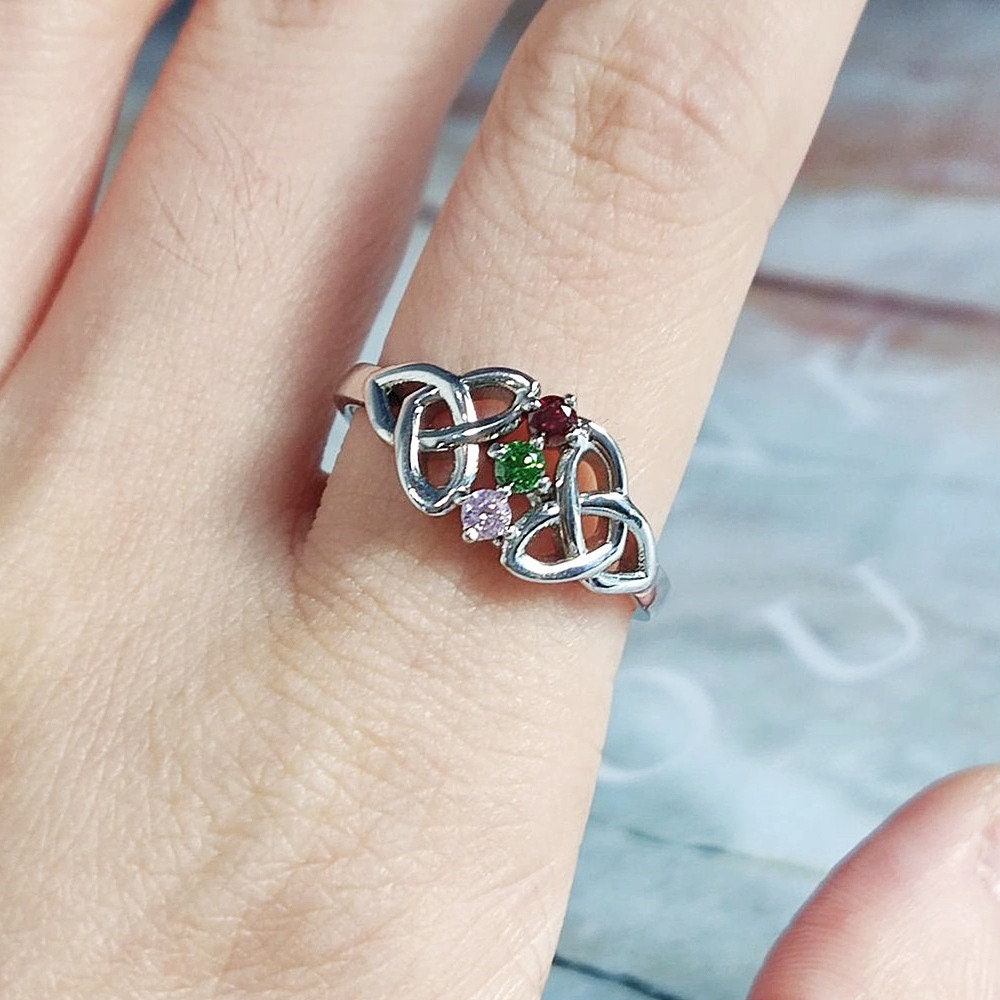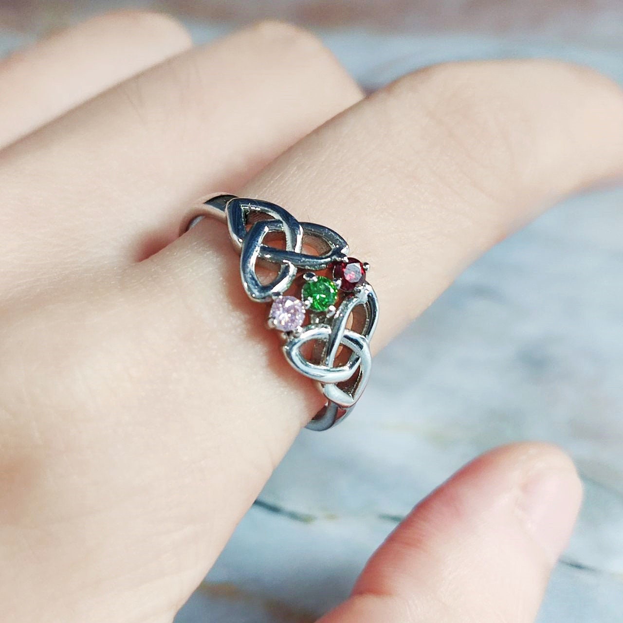 This Celtic knot ring is made by 925 sterling silver, it can be customized 3 birthstones with your choice. Personalized you and your love's birthstone to made this ring a unique gift for mom, wife, grandma, sister, daughter, best friends. It's a perfect choice for Christmas gifts, Mother’s Day gifts, Birthday gifts, Friendship gifts, Graduation gifts, Valentines day gifts for her, Wedding ring, Promise ring, Engagement ring, Anniversary ring, Girlfriend ring, Wife ring, Daily-wear rings, Memorial jewelry or anytime!