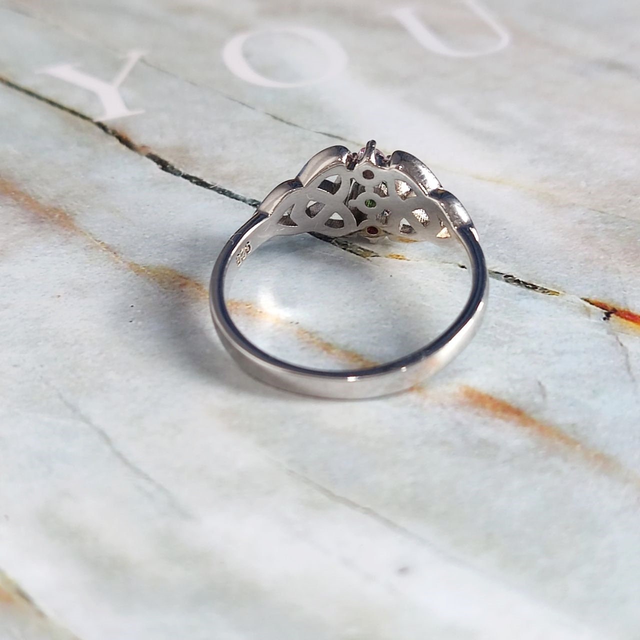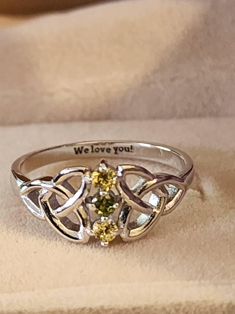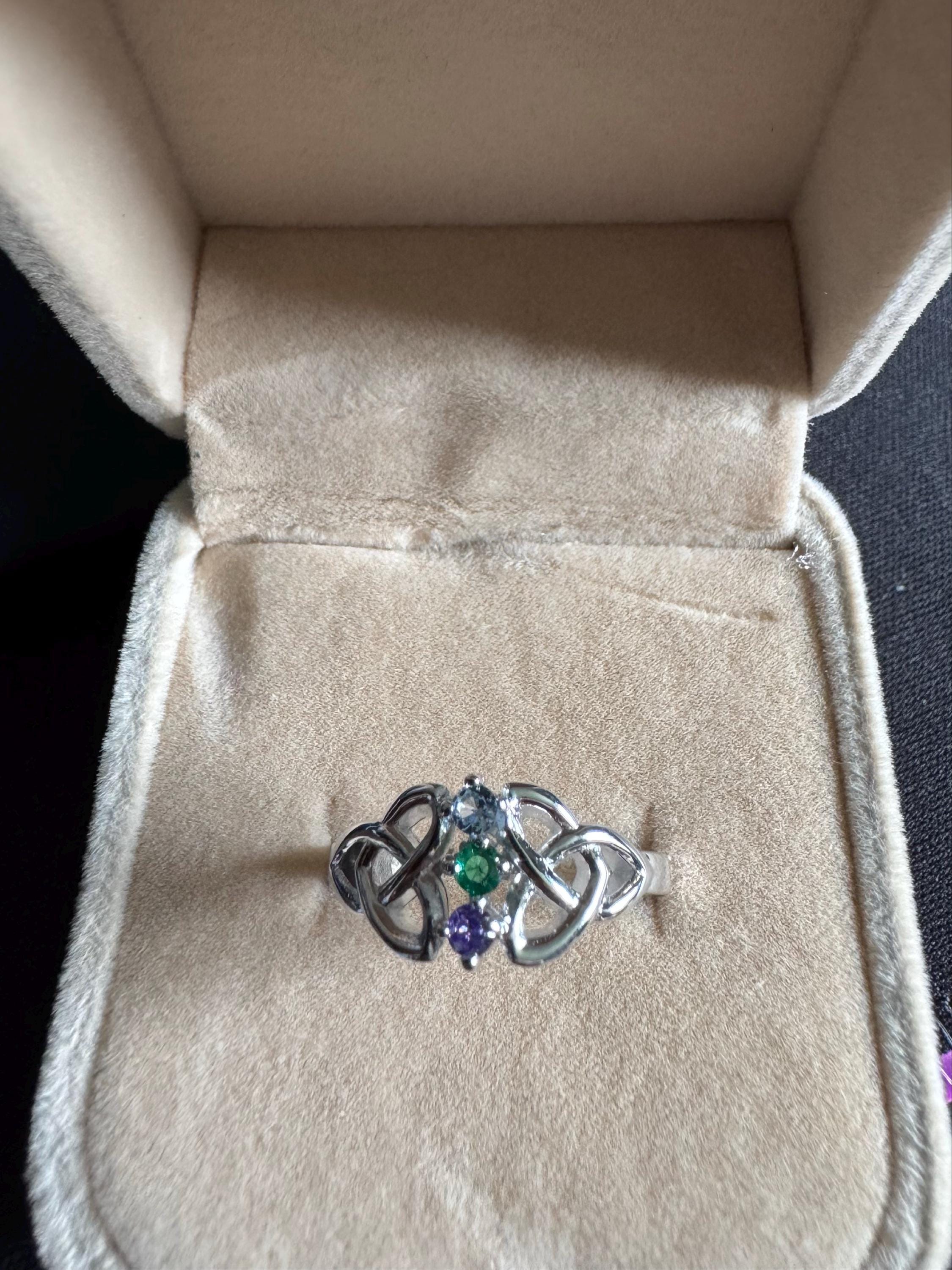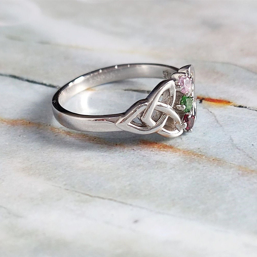 This Celtic knot ring is made by 925 sterling silver, it can be customized 3 birthstones with your choice. Personalized you and your love's birthstone to made this ring a unique gift for mom, wife, grandma, sister, daughter, best friends. It's a perfect choice for Christmas gifts, Mother’s Day gifts, Birthday gifts, Friendship gifts, Graduation gifts, Valentines day gifts for her, Wedding ring, Promise ring, Engagement ring, Anniversary ring, Girlfriend ring, Wife ring, Daily-wear rings, Memorial jewelry or anytime!