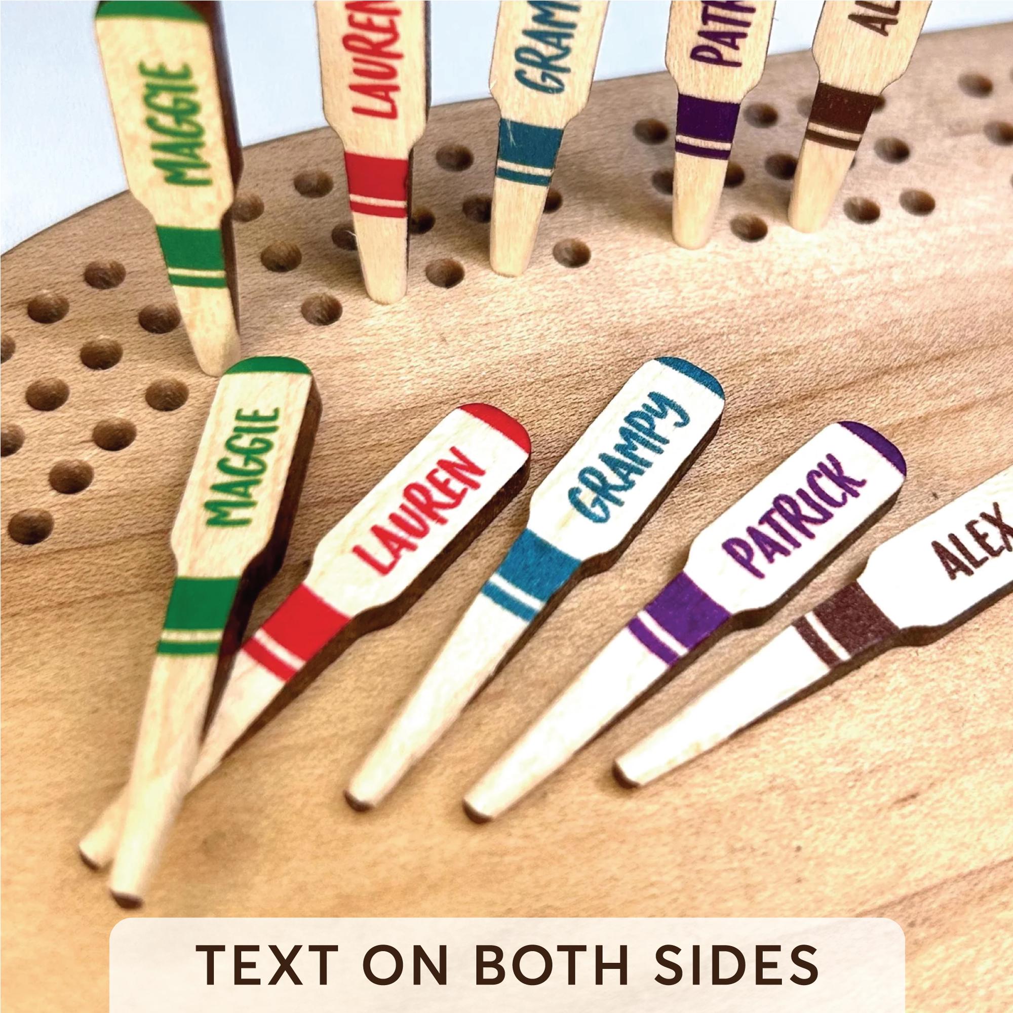 Personalized name cribbage pegs now double sided in color. Crafted with precision and colorful fun, these popular wooden name cribbage pegs are now available in several vibrant color options, and bonus: each name is in color on both sides of the pegs. Your name on a peg for each player adds a unique touch to your cribbage game. Each one is meticulously designed from solid maple wood, ensuring durability. Personalized with names, initials, or fun words these cribbage pegs make for a thoughtful gift or a special addition to your own collection. The colorful finish brings flair to every game, making it easy to keep track of each player's progress. Elevate your gaming experience with these custom-made name cribbage pegs that combine style and functionality. Whether for yourself or a loved one, these pegs are sure to stand out and bring joy to every cribbage match.