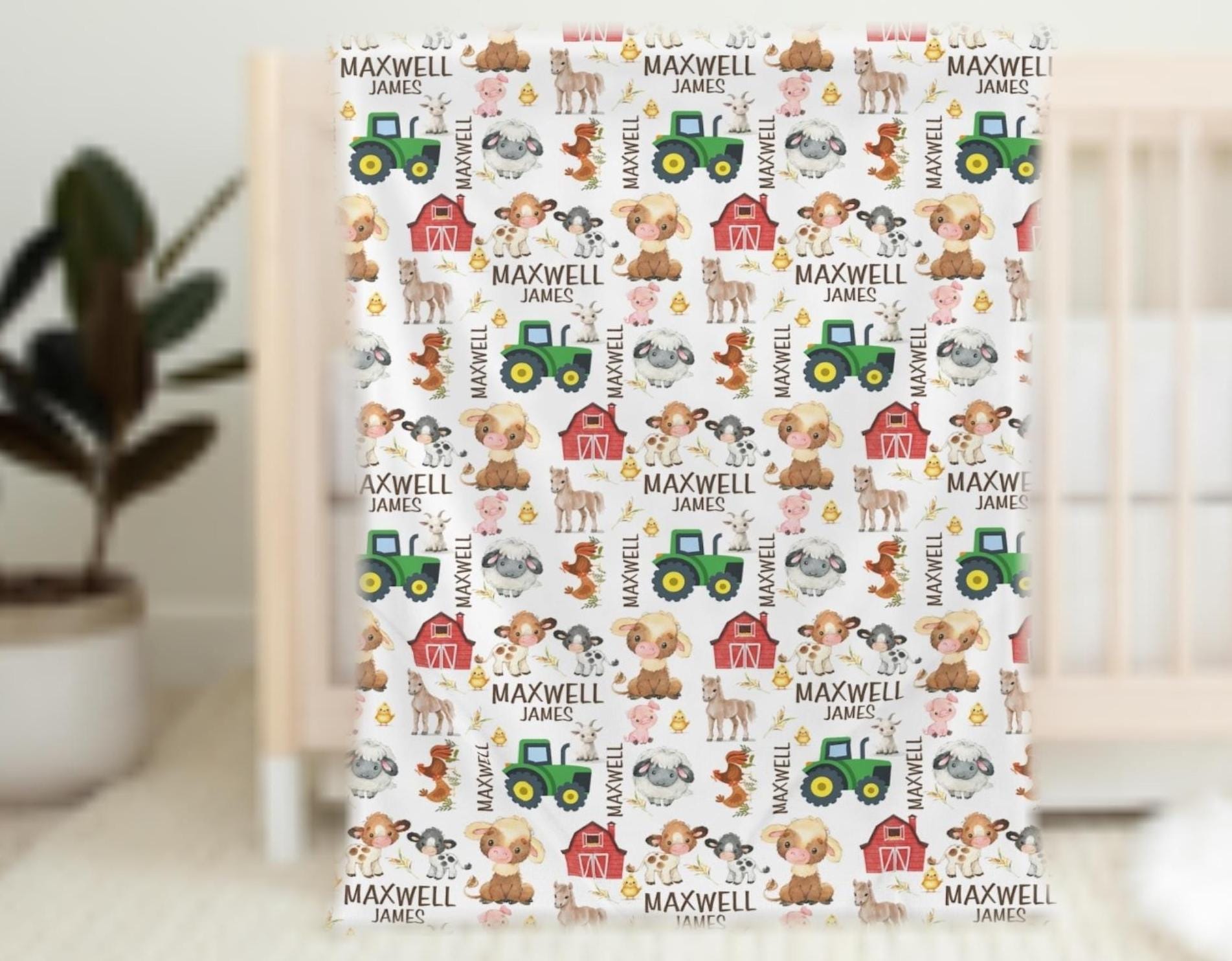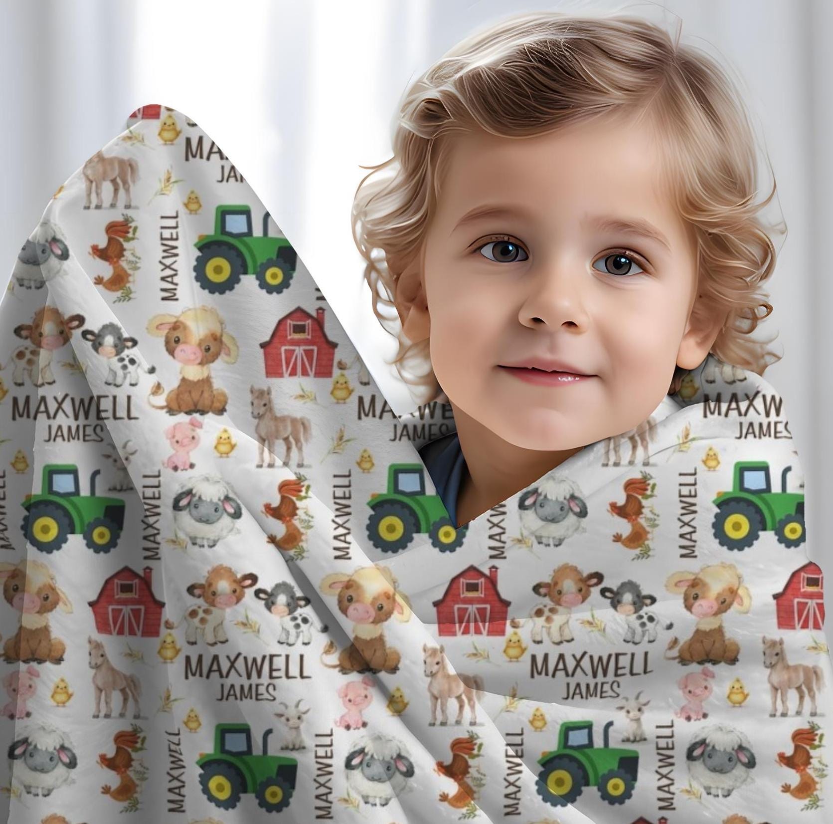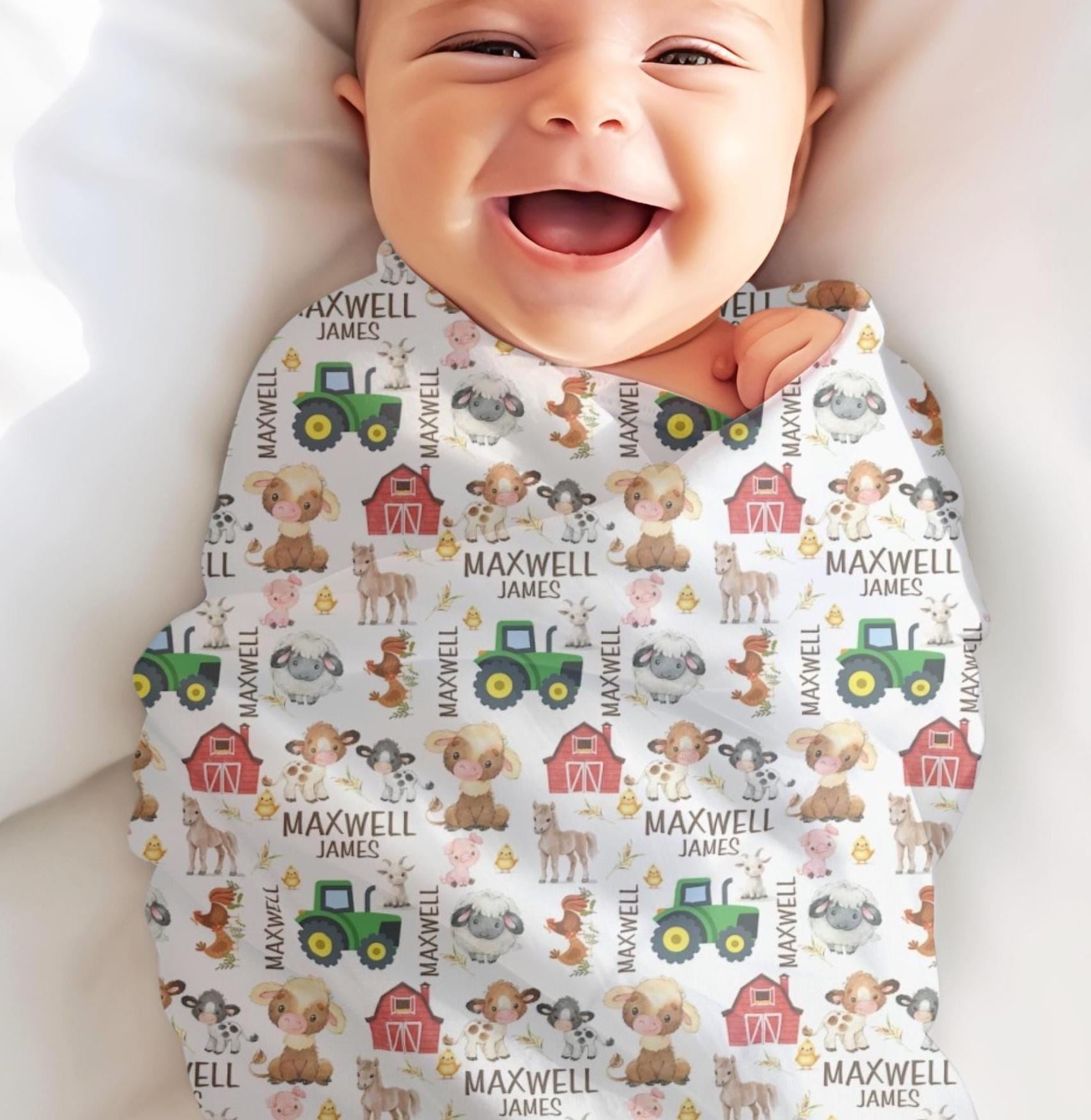 Farm Animal Blanket Baby Boy Personalized Boy Name Blanket Green Tractor Newborn Swaddle Cow Pig Goat Blanket with Name Hospital Blanket, F54