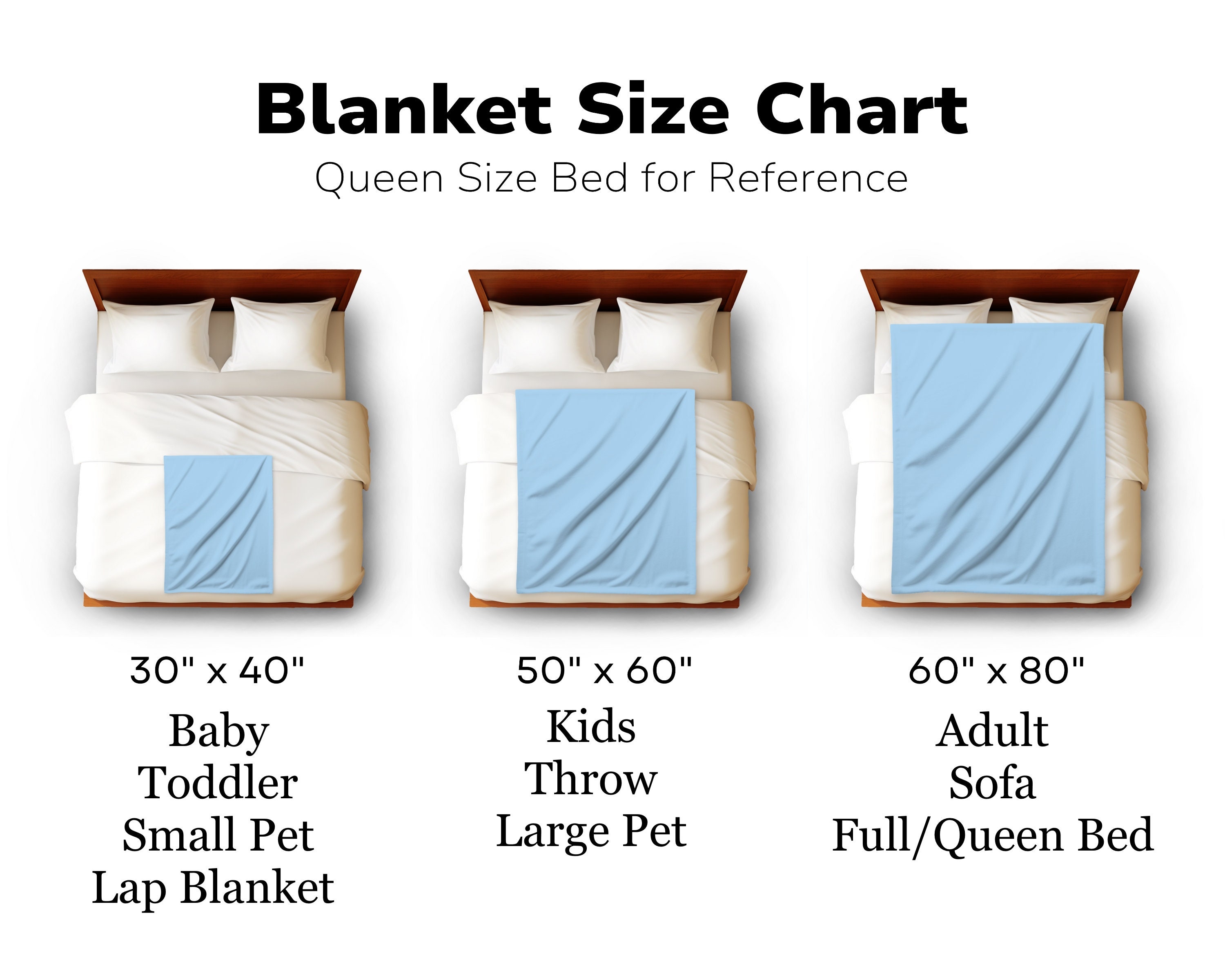 50" x 60" - for little kids through adults, also makes a great throw or travel blanket
