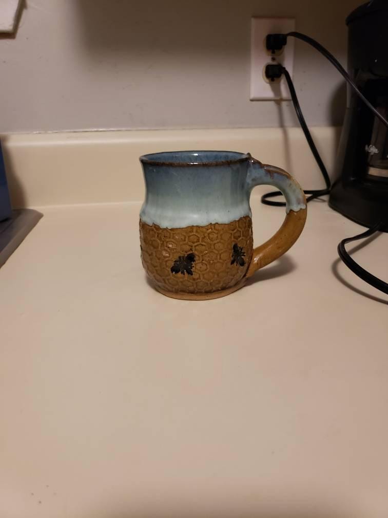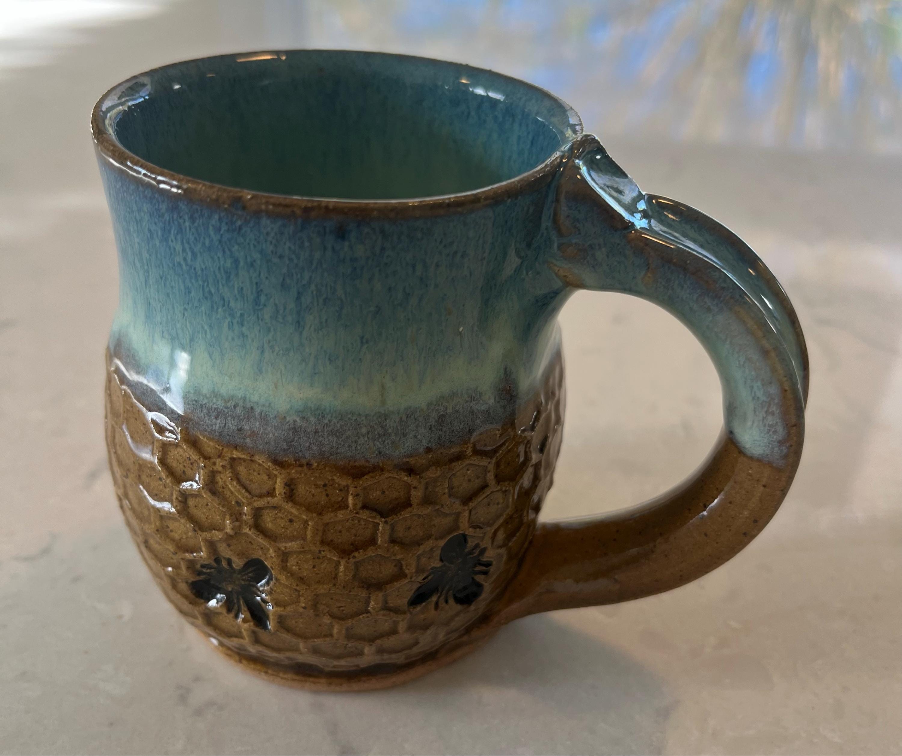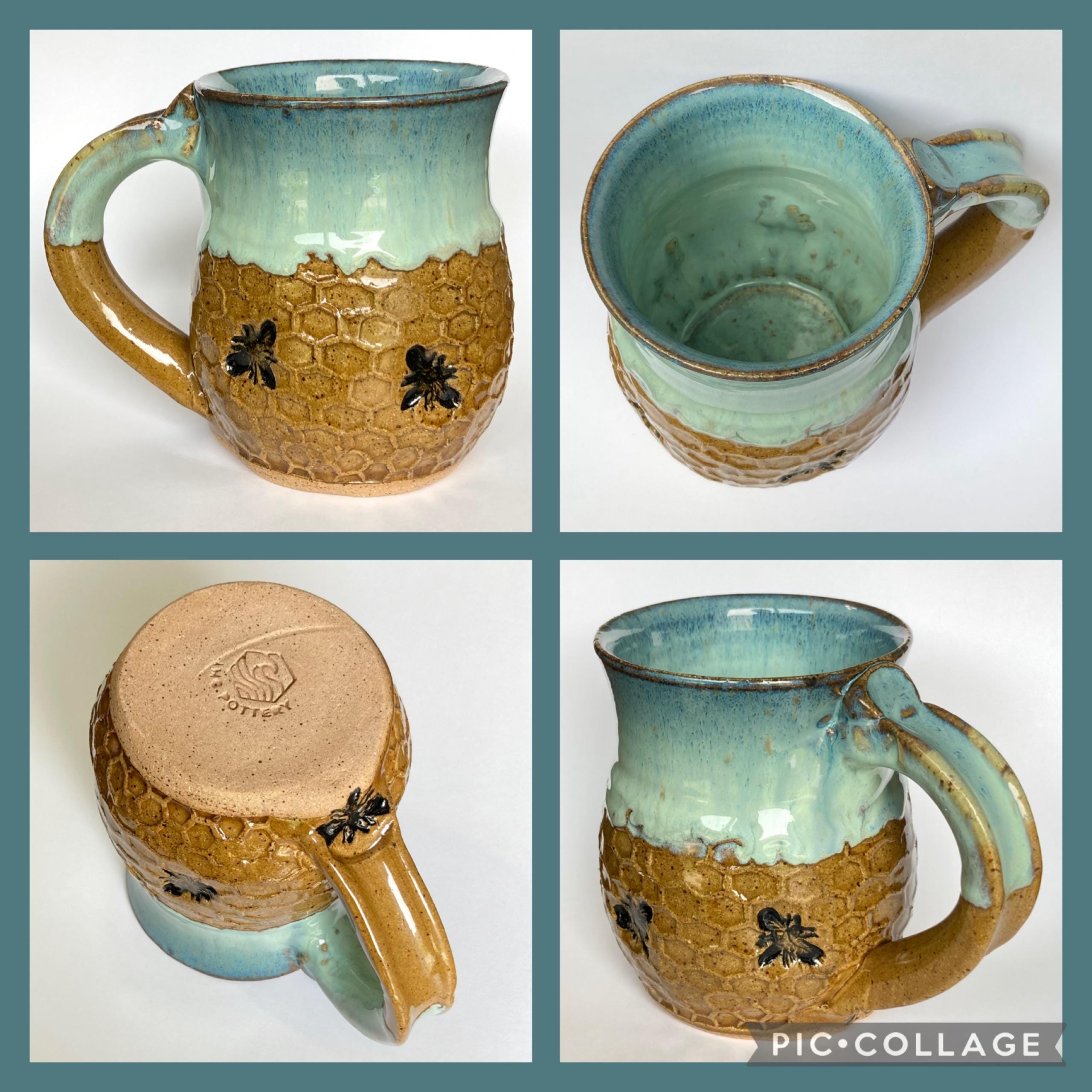 Handmade Bee Pottery Mug: Honeycomb Design, Sea Foam Blue Rim