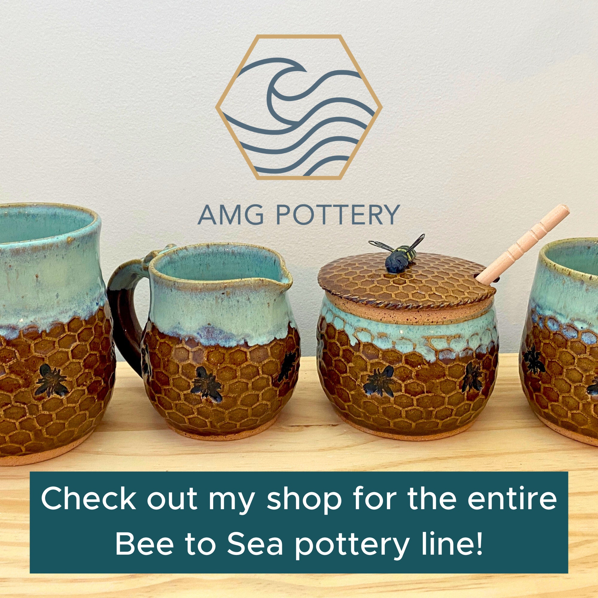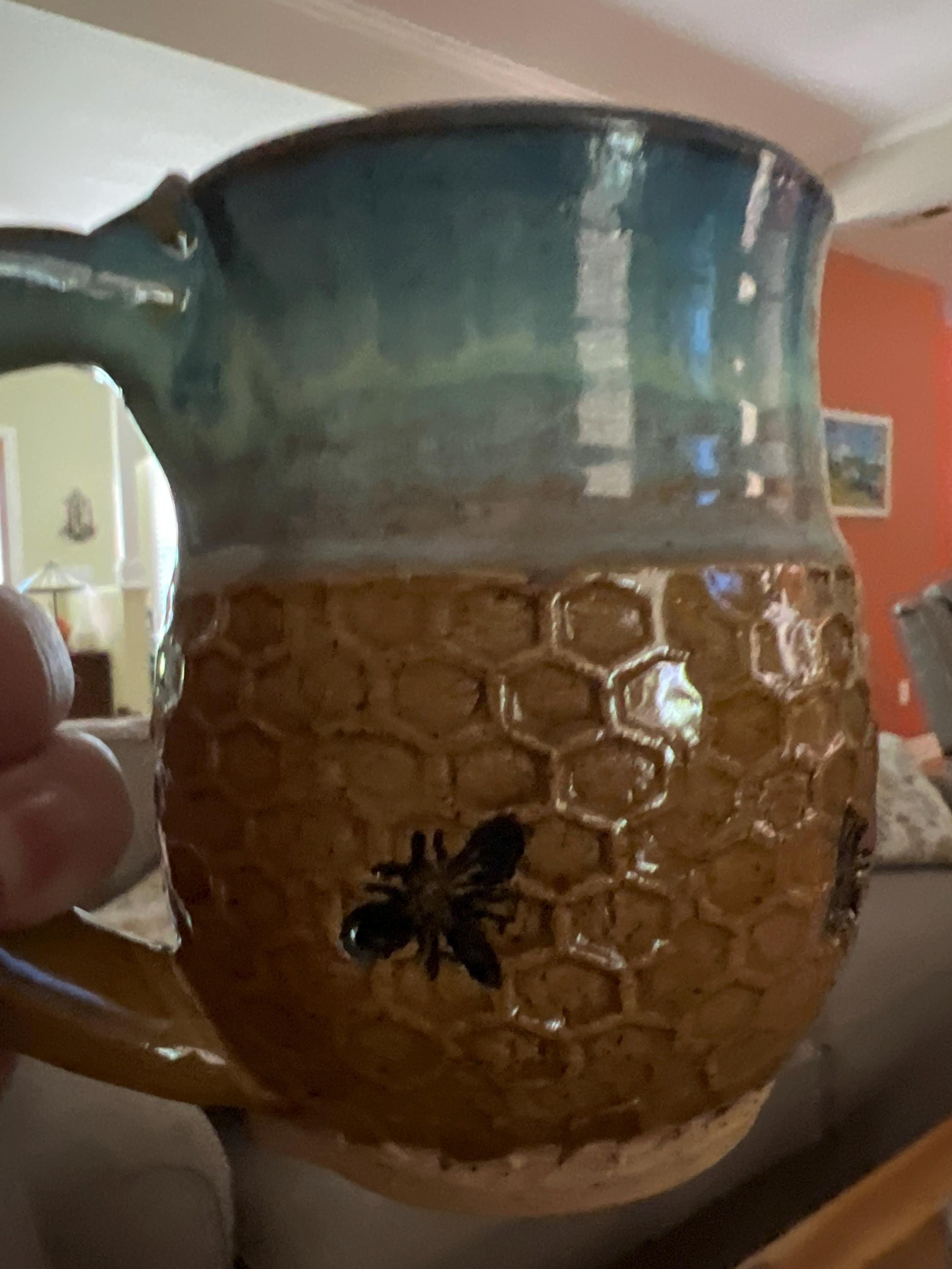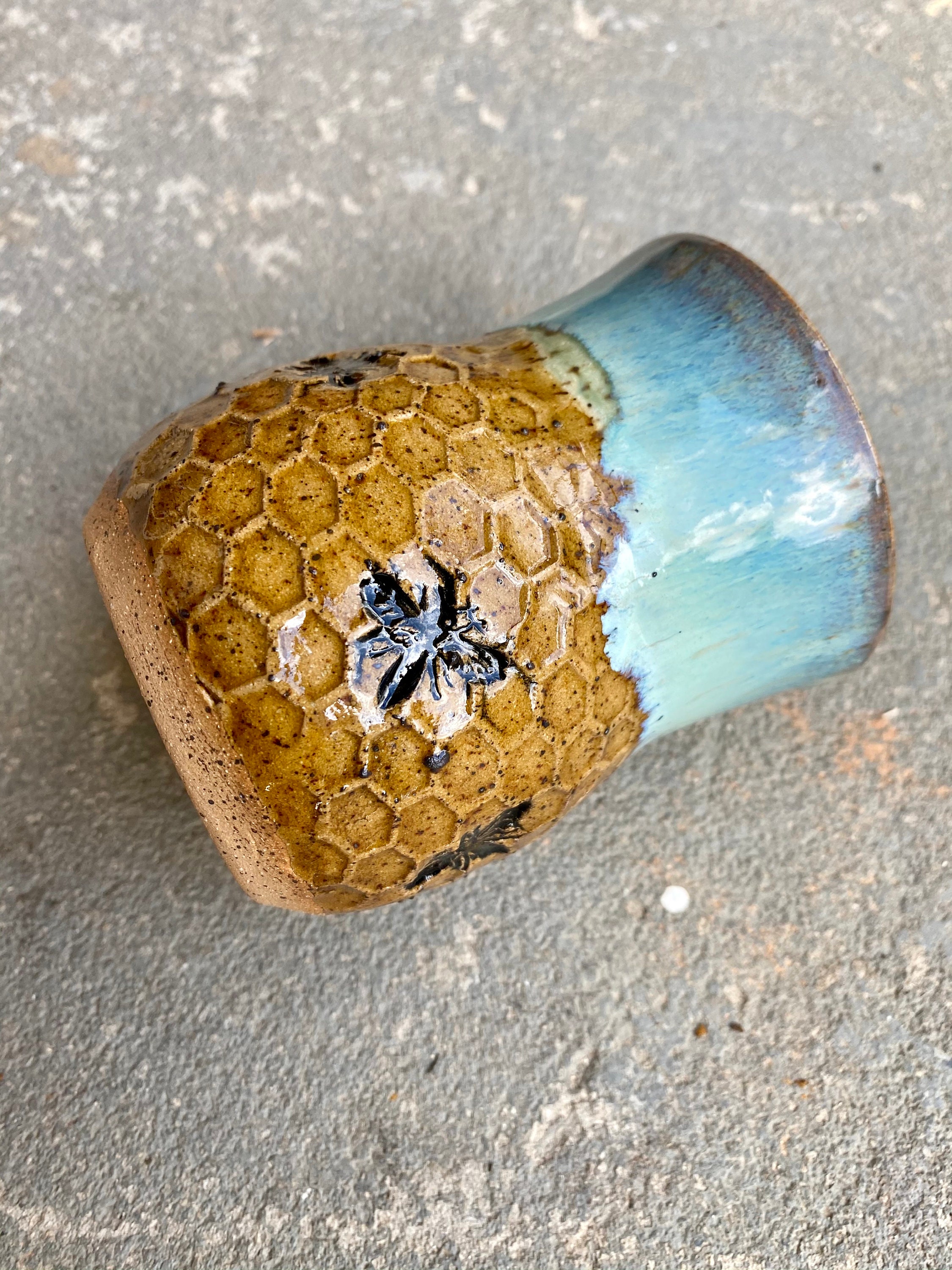 Handmade Bee Pottery Mug: Honeycomb Design, Sea Foam Blue Rim