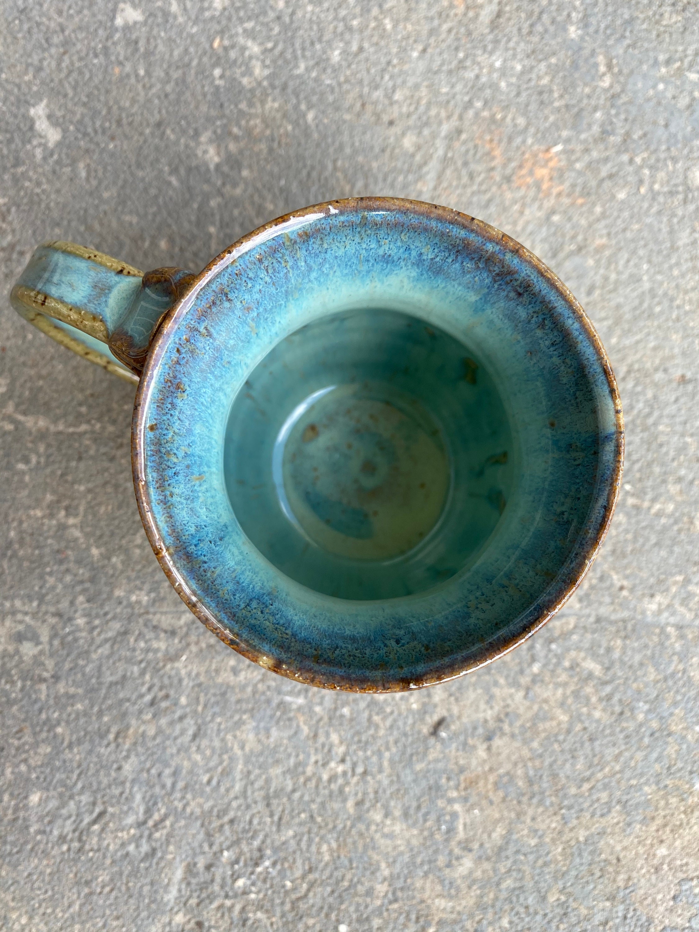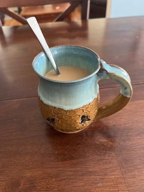 This handcrafted ceramic mug features a warm mustard yellow honeycomb pattern with a cute bee motif and a blue seafoam rim. Find your coffee and tea where the Bee Mug meets the sea. Due to its handcrafted nature, colors and sizes may vary slightly. Thank you for supporting local artists like me!