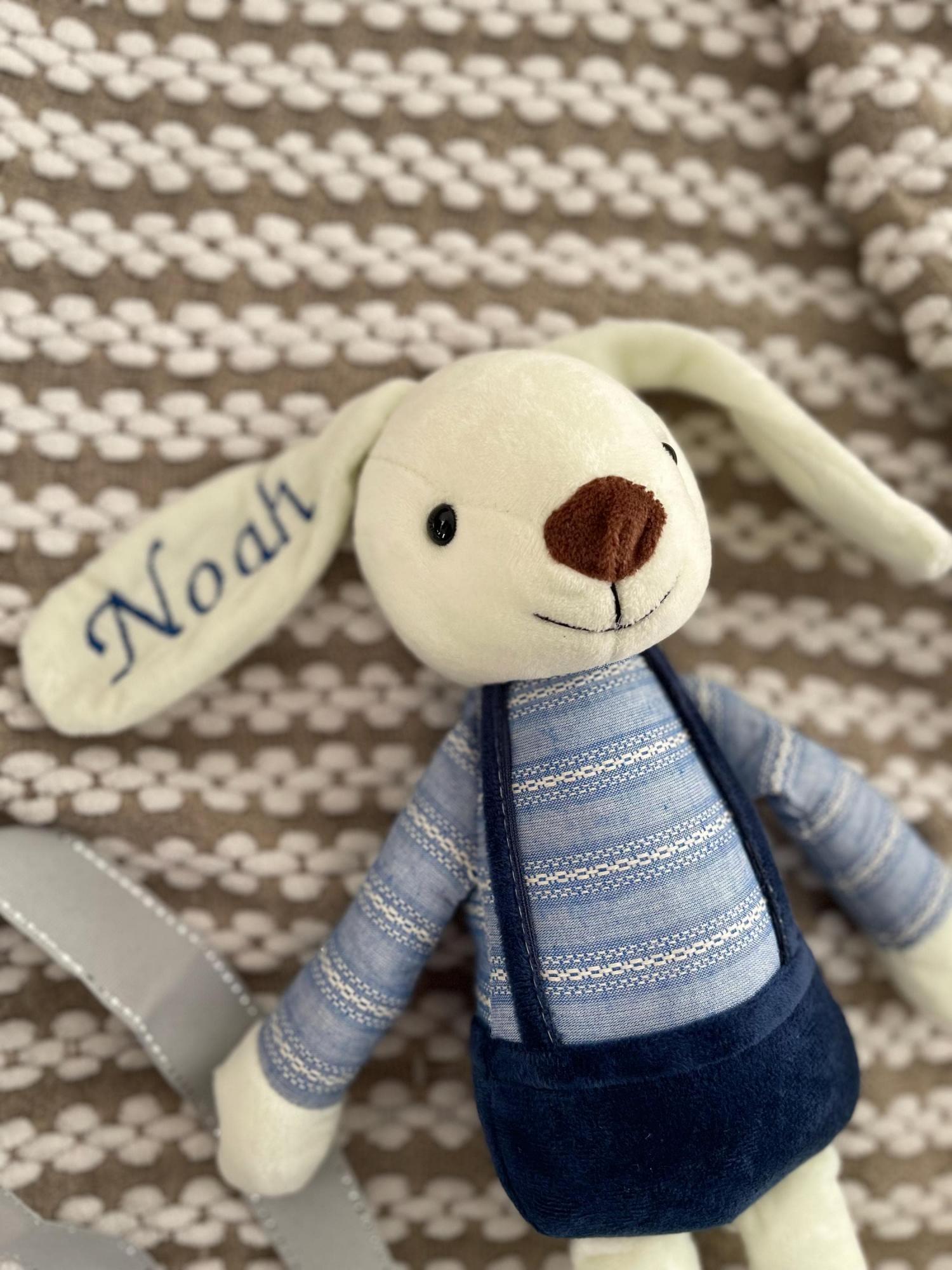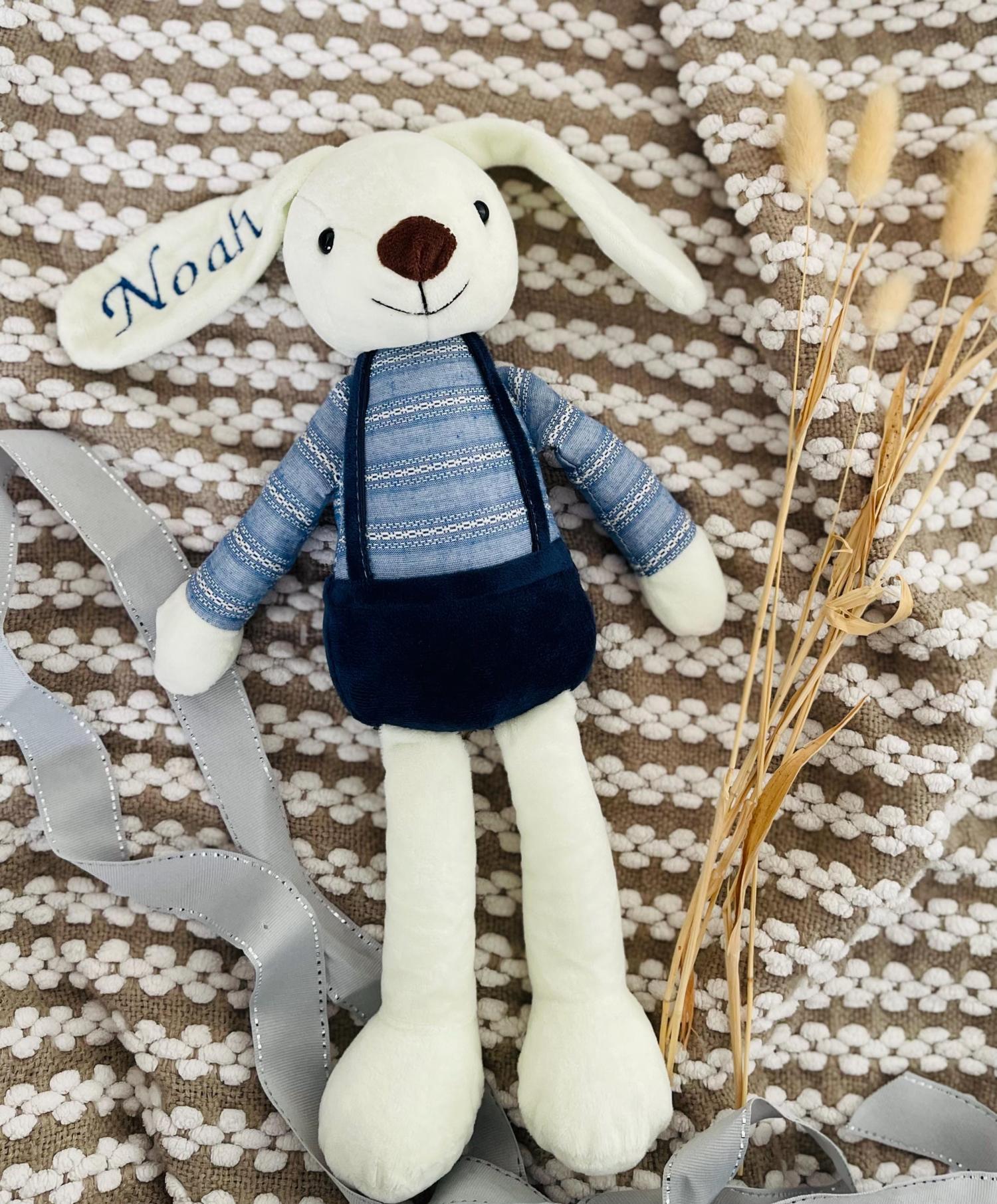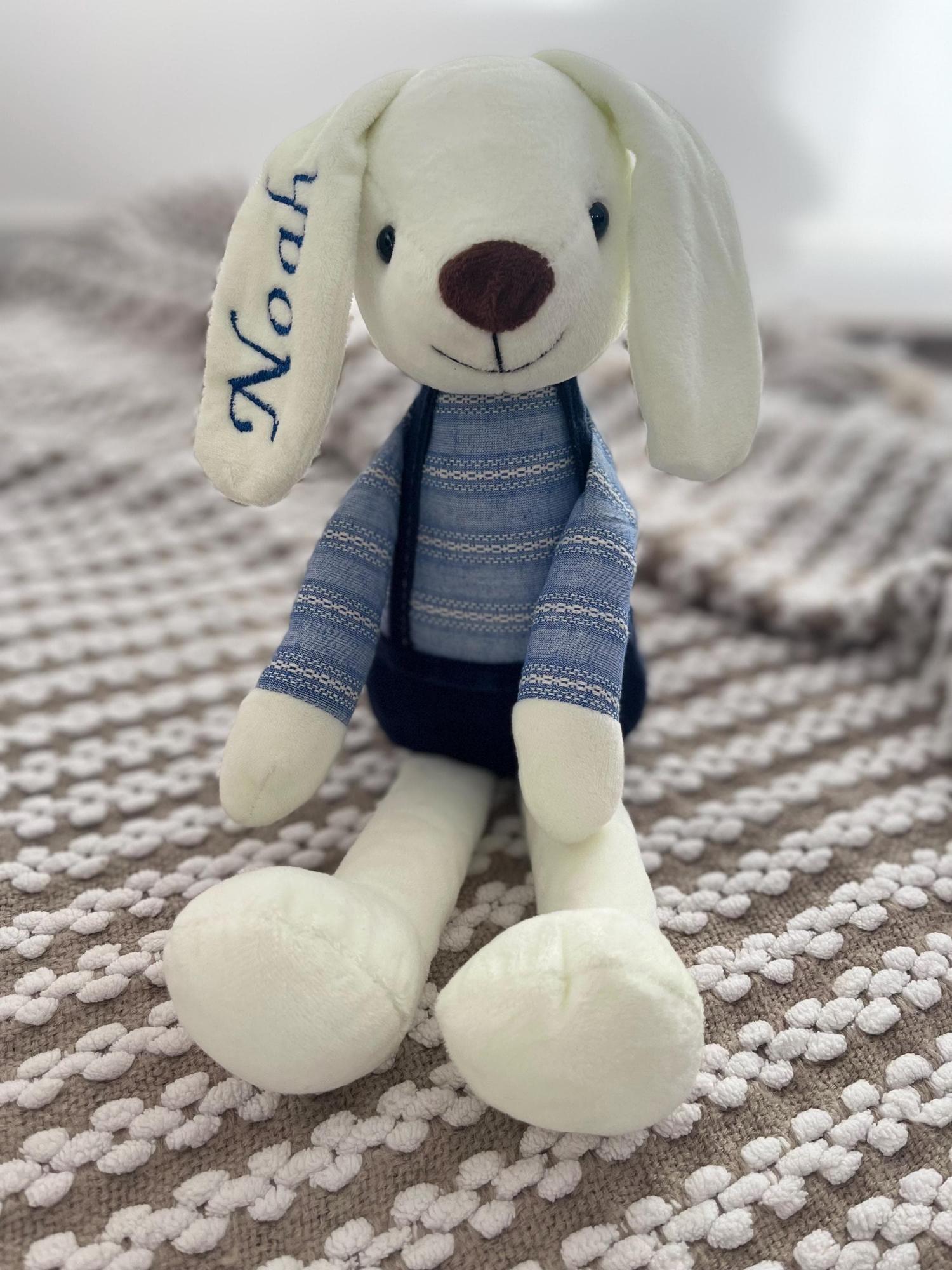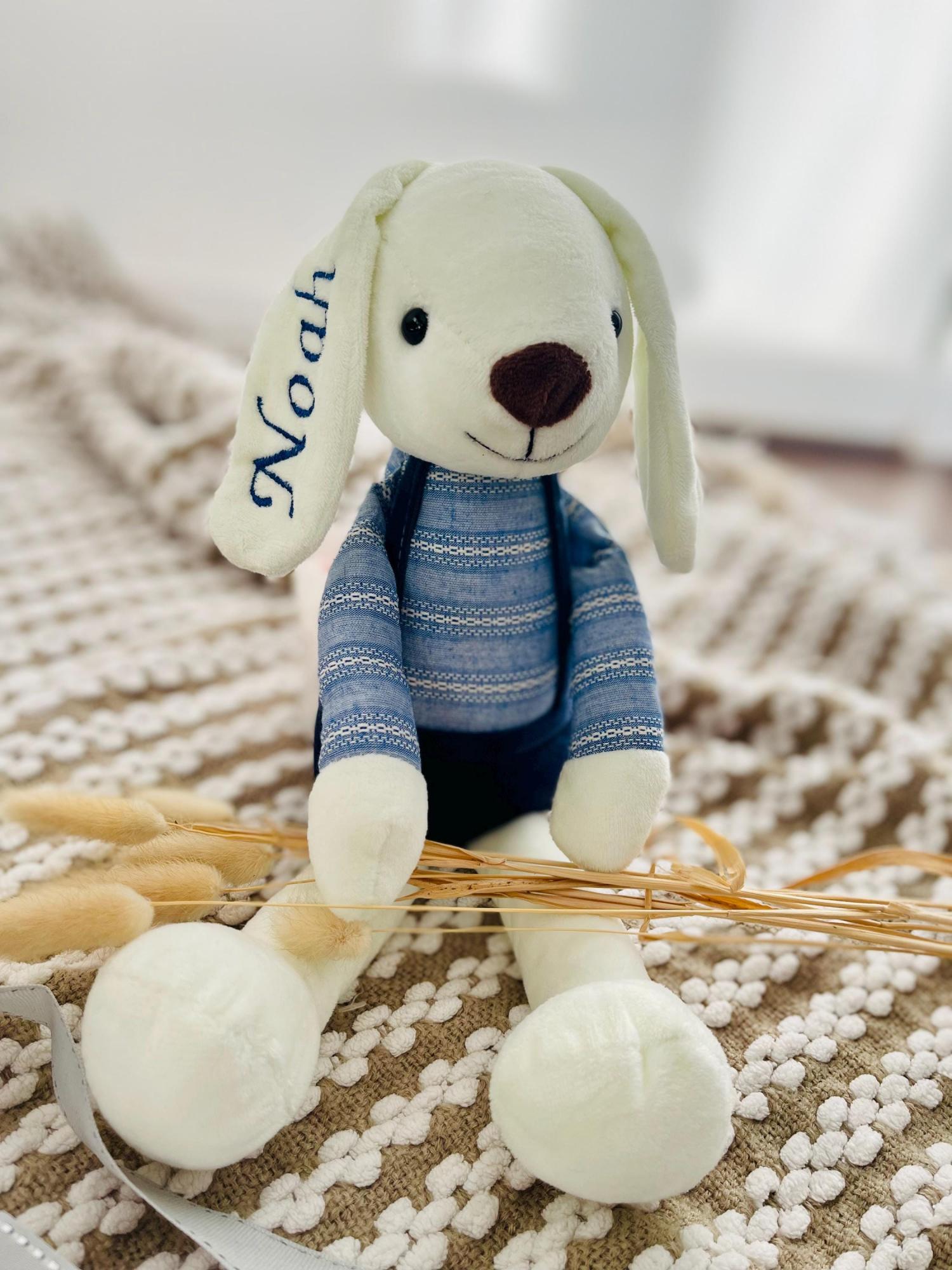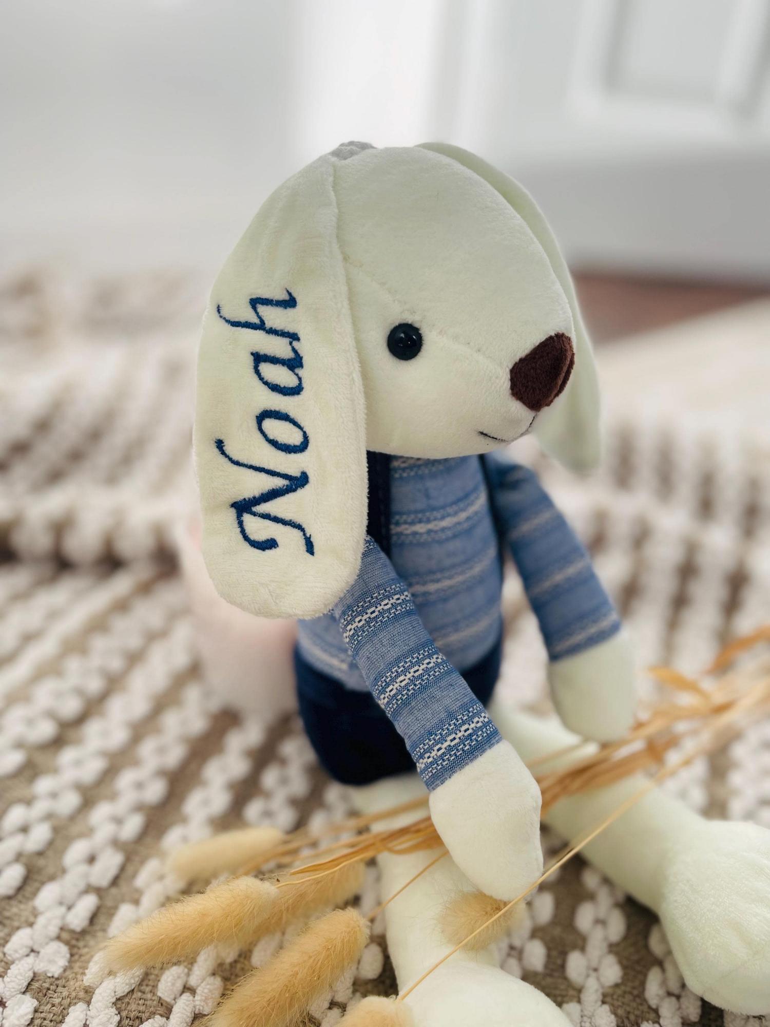 Looking for a custom plush toy that is soft, cuddly, and extra special? Our embroidered bunny is the perfect baby keepsake gift for Christmas, Easter, birthdays, baby showers, or any special moment. The baby name plush is carefully embroidered on the ear, making it a one-of-a-kind gift for your little one.