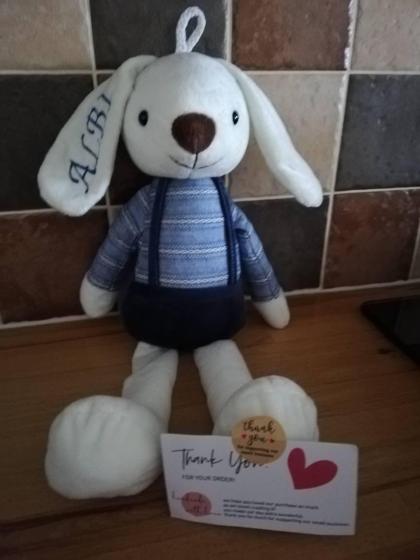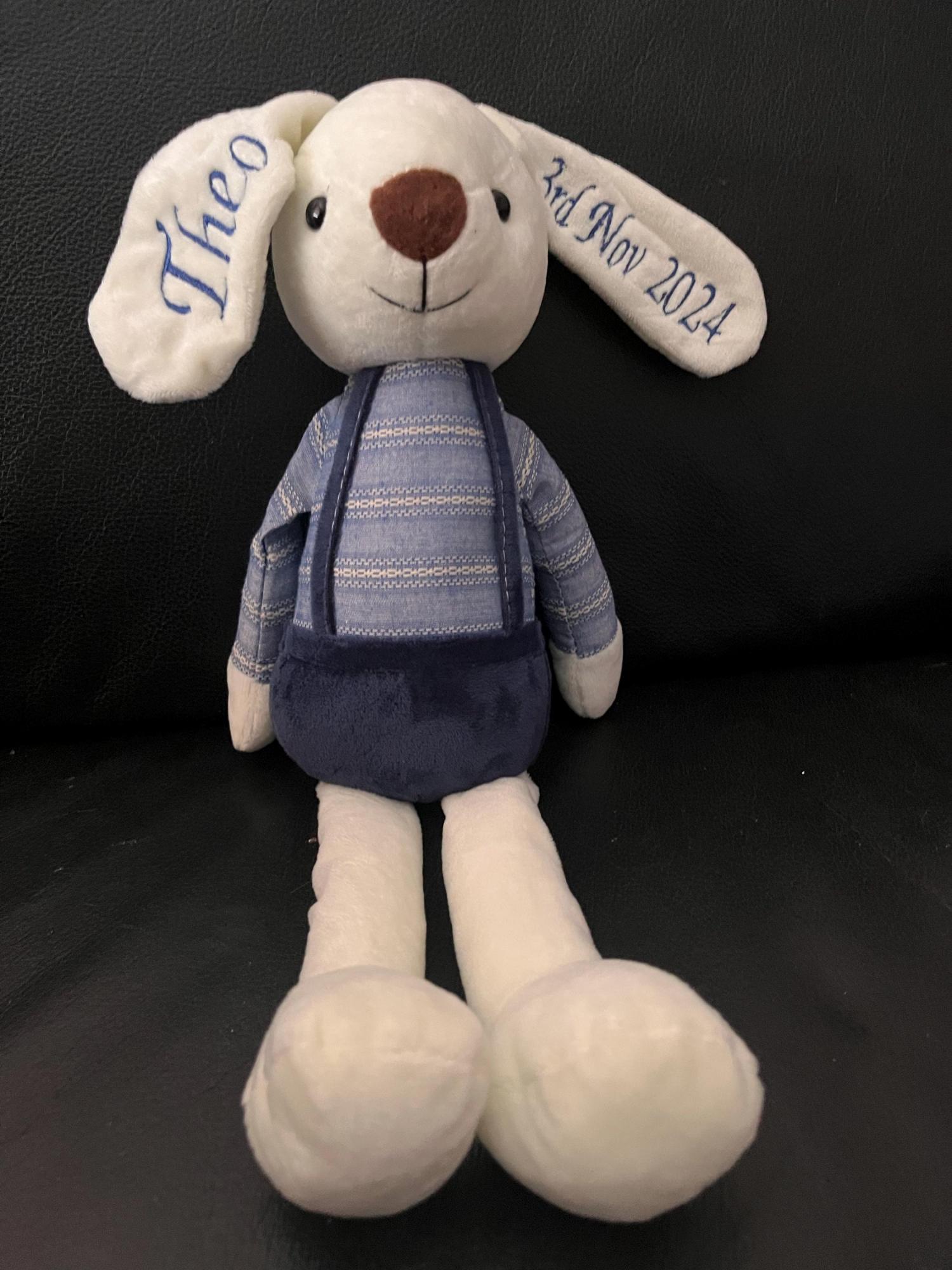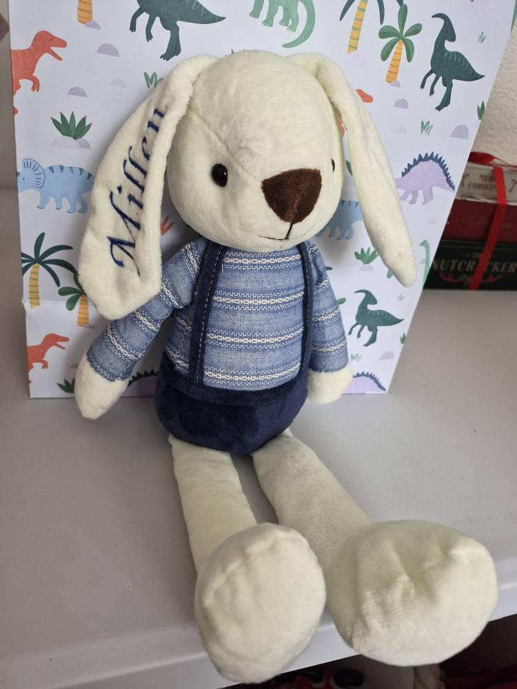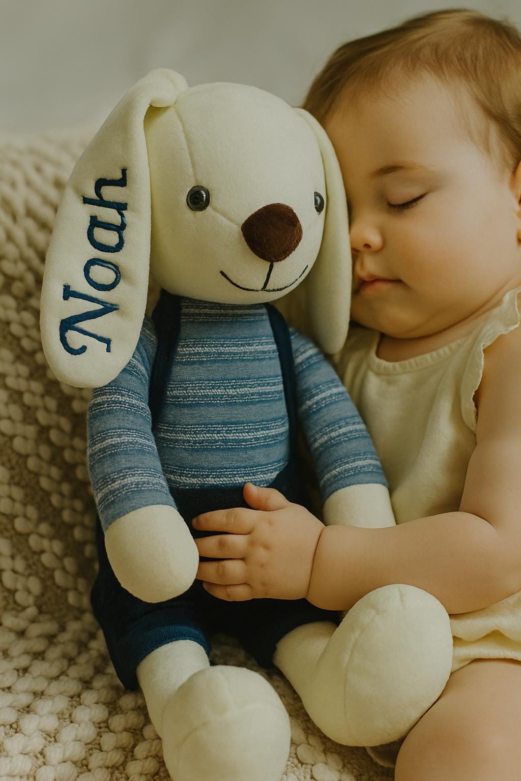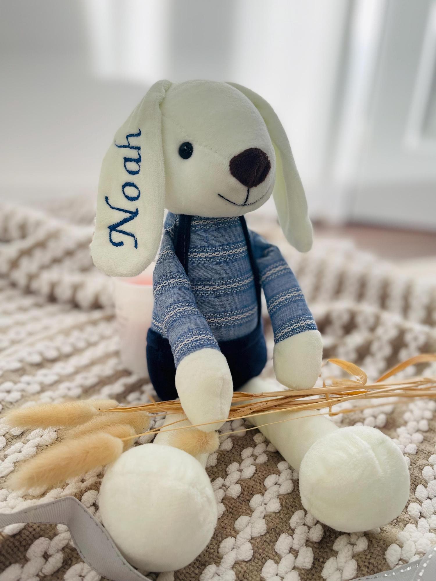 Looking for a custom plush toy that is soft, cuddly, and extra special? Our embroidered bunny is the perfect baby keepsake gift for Christmas, Easter, birthdays, baby showers, or any special moment. The baby name plush is carefully embroidered on the ear, making it a one-of-a-kind gift for your little one.