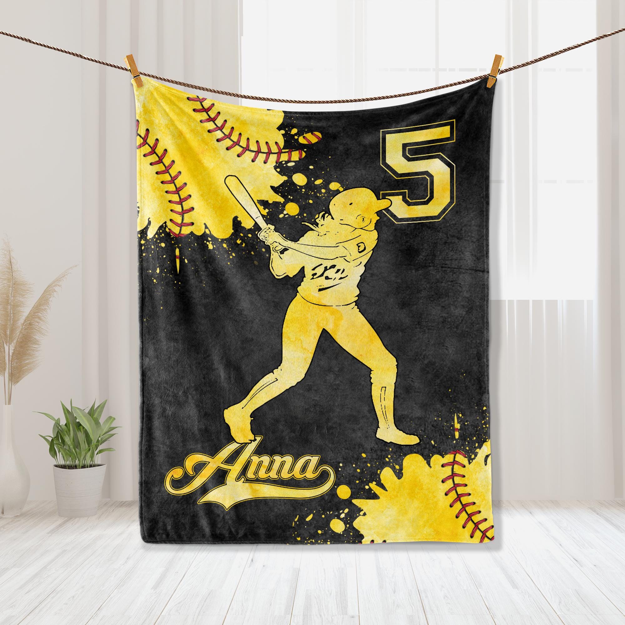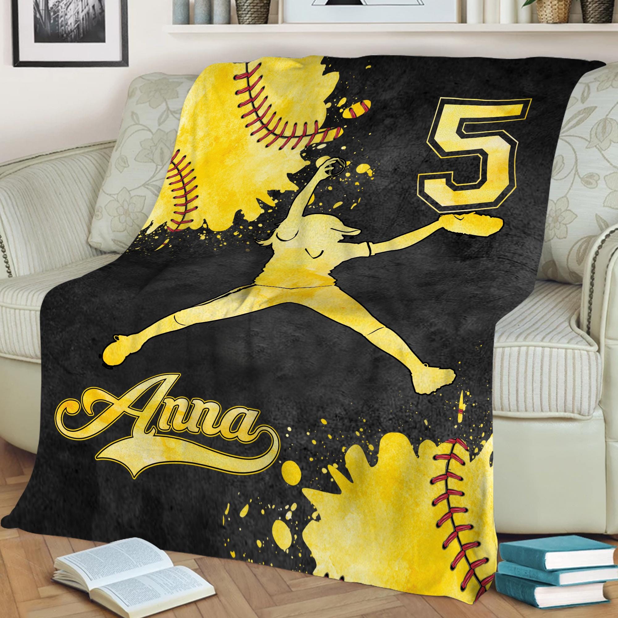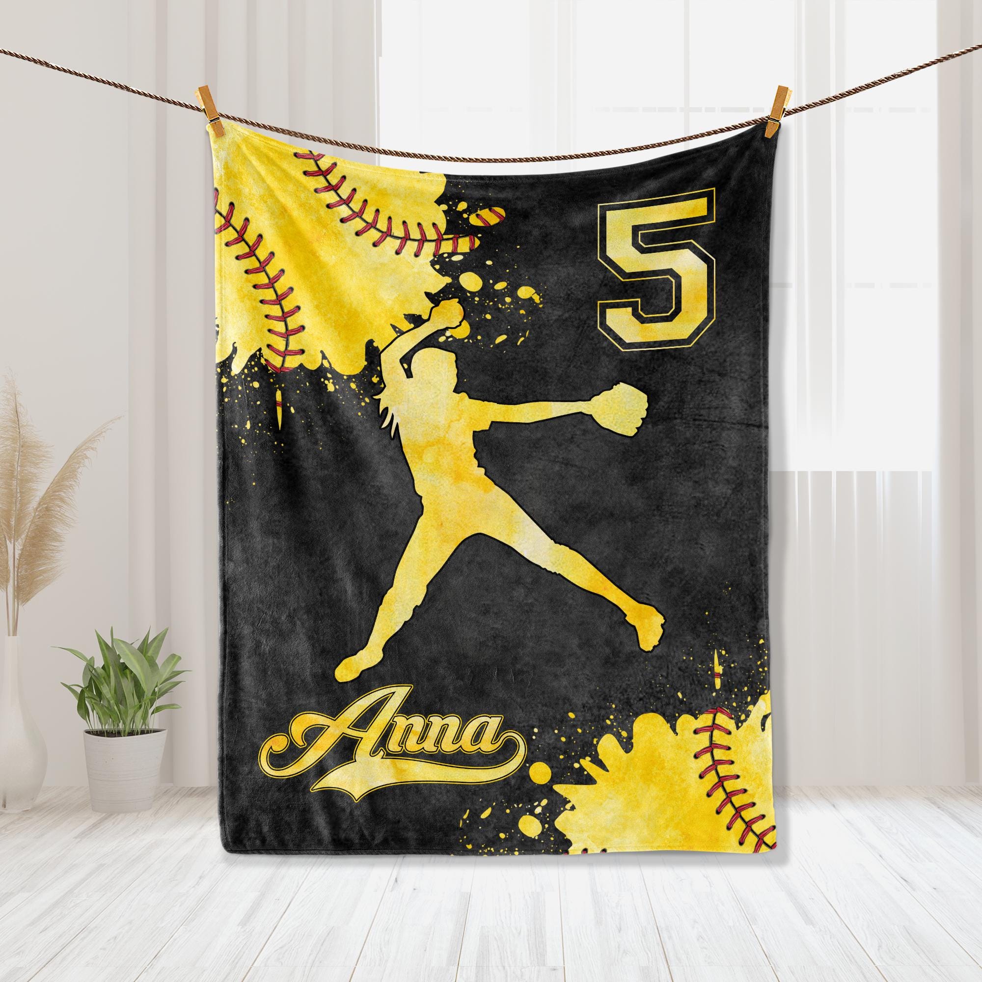 Personalized Softball Blanket, Custom Name Number Soft Cozy Sherpa Fleece Throw Blanket, Sport Gift for Daughter, Girl, Kid, Team