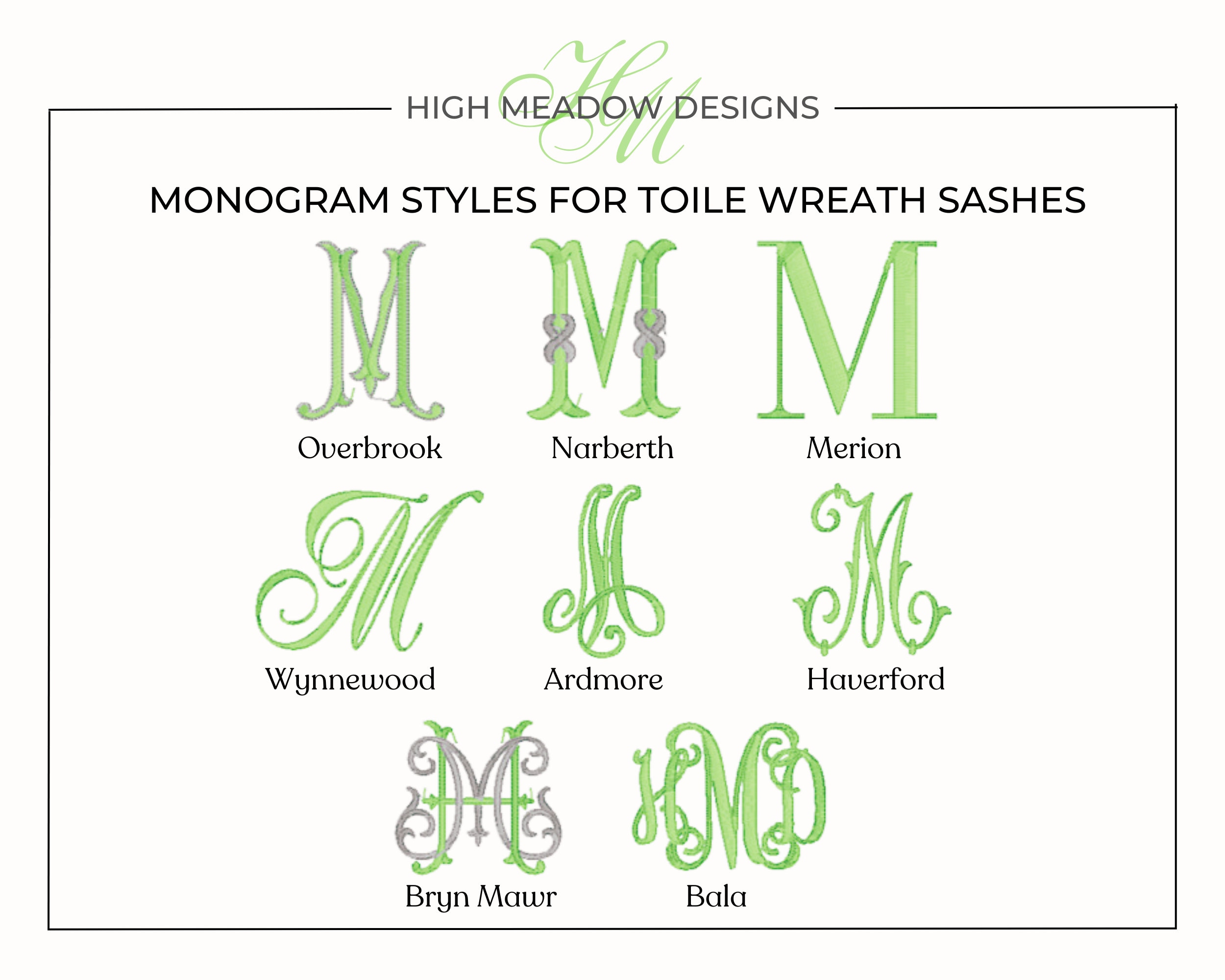 *In the case of the Narberth and Overbrook monograms, please specify the accent color for the ribbon/outline on the letter. The pictured gold/tan/champagne works well if you can't decide.