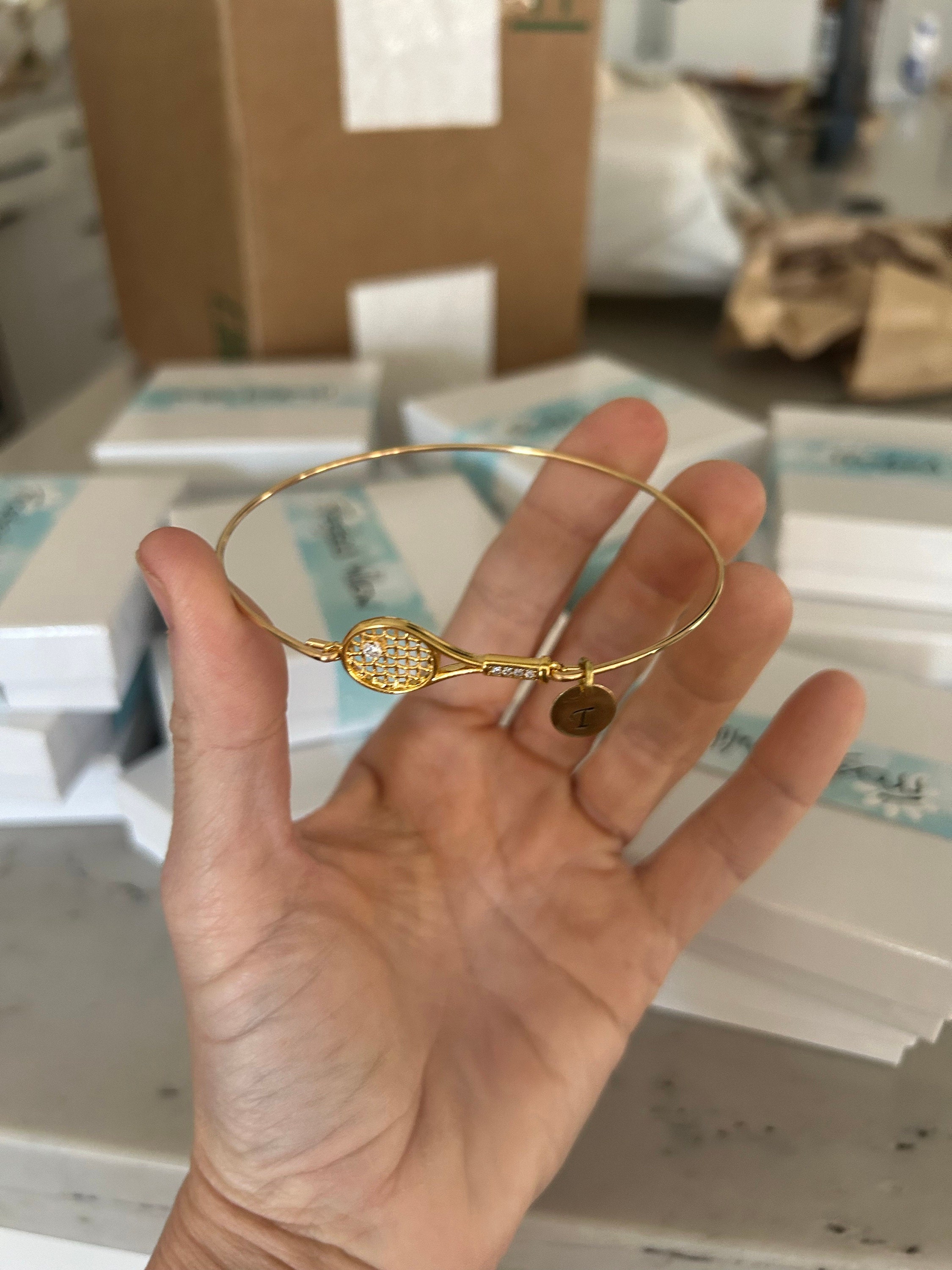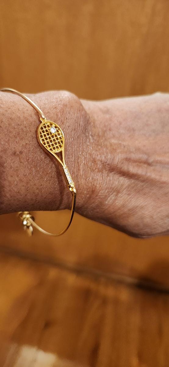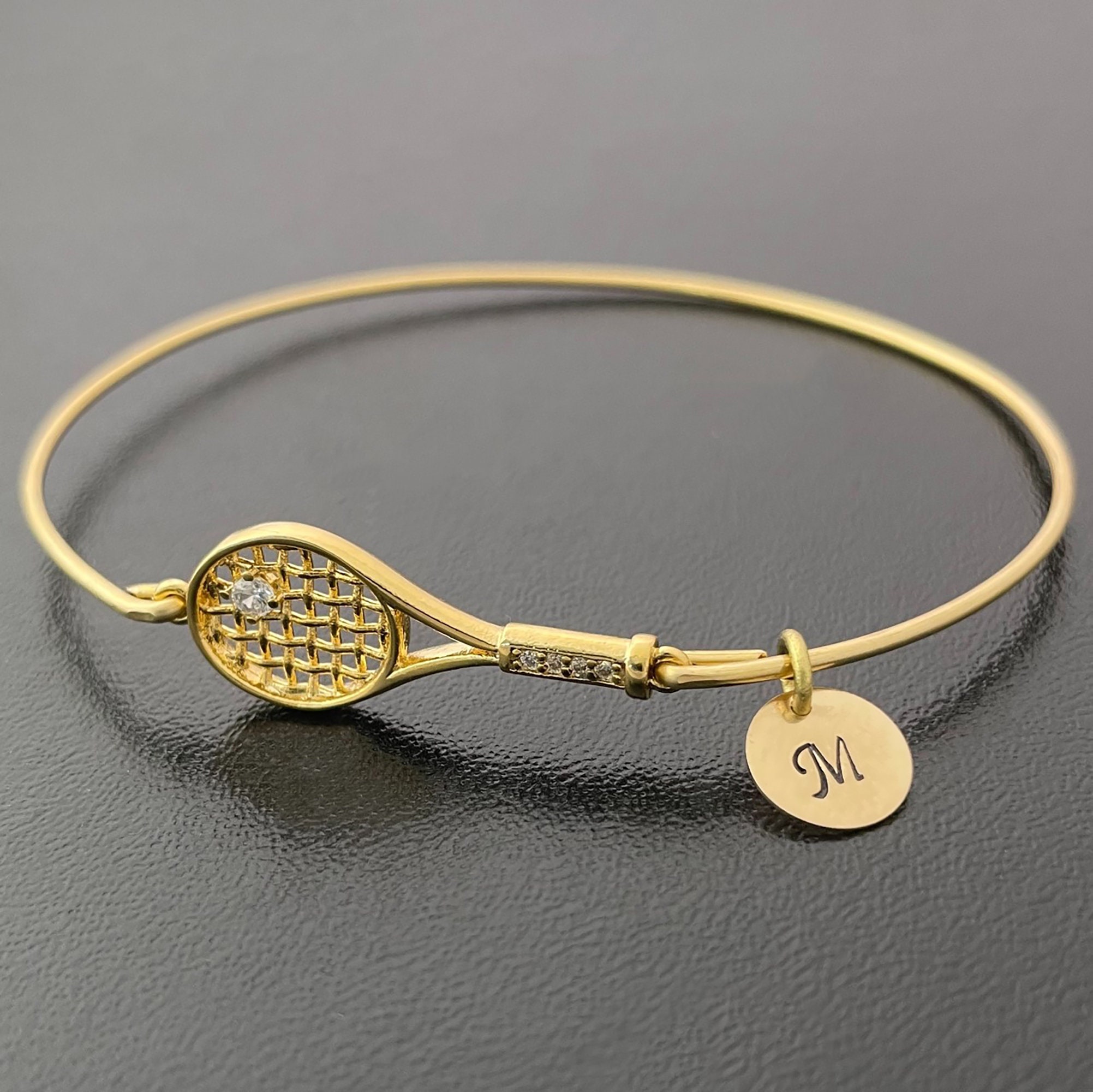 This tennis bracelet is made of 24K gold-plated material and features a rhinestone tennis ball, with rhinestones also set in the racket handle. Optional accessories include 14K gold-plated letter pendants and/or team year pendants, as well as a 14K gold-plated bracelet band.