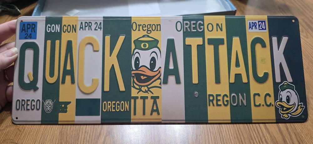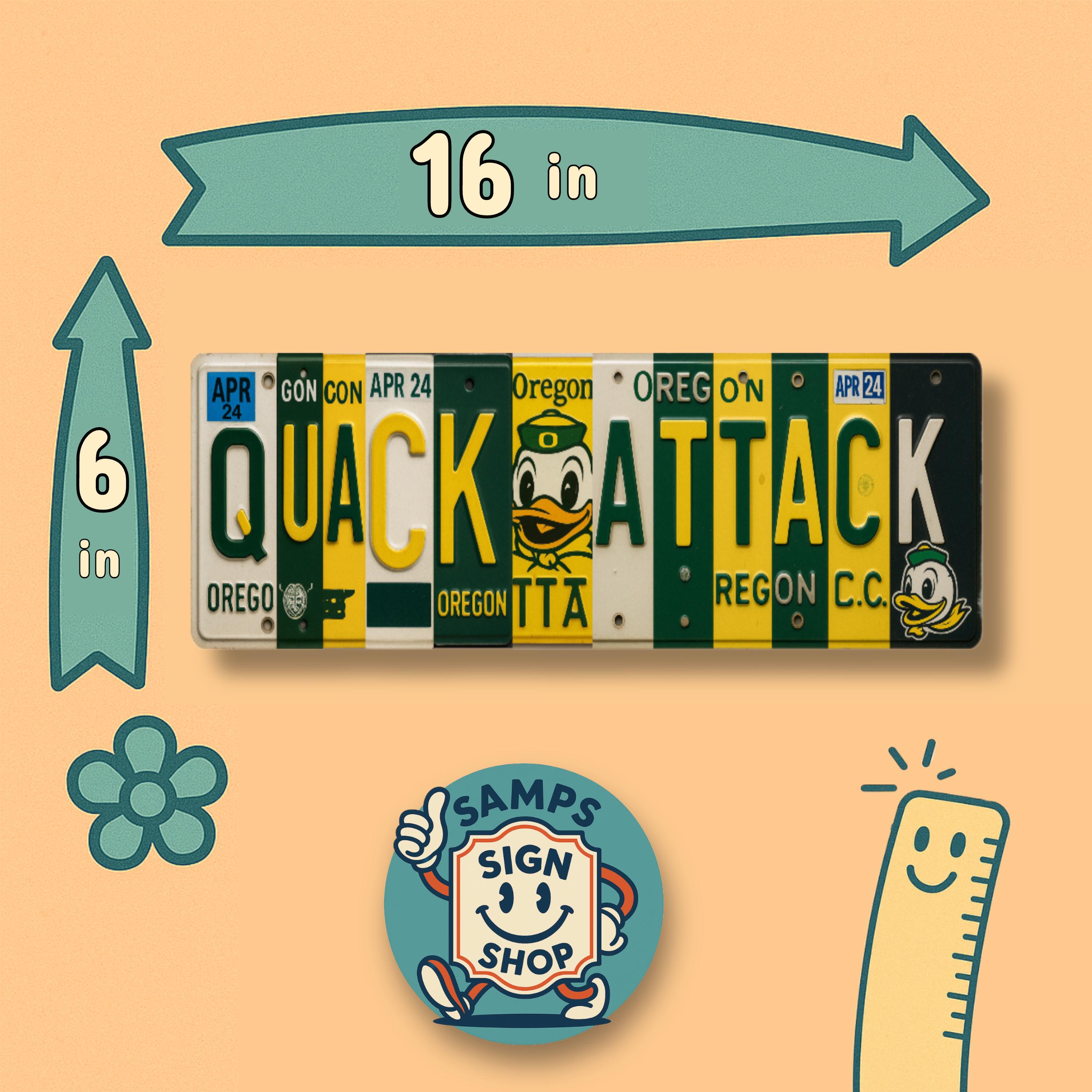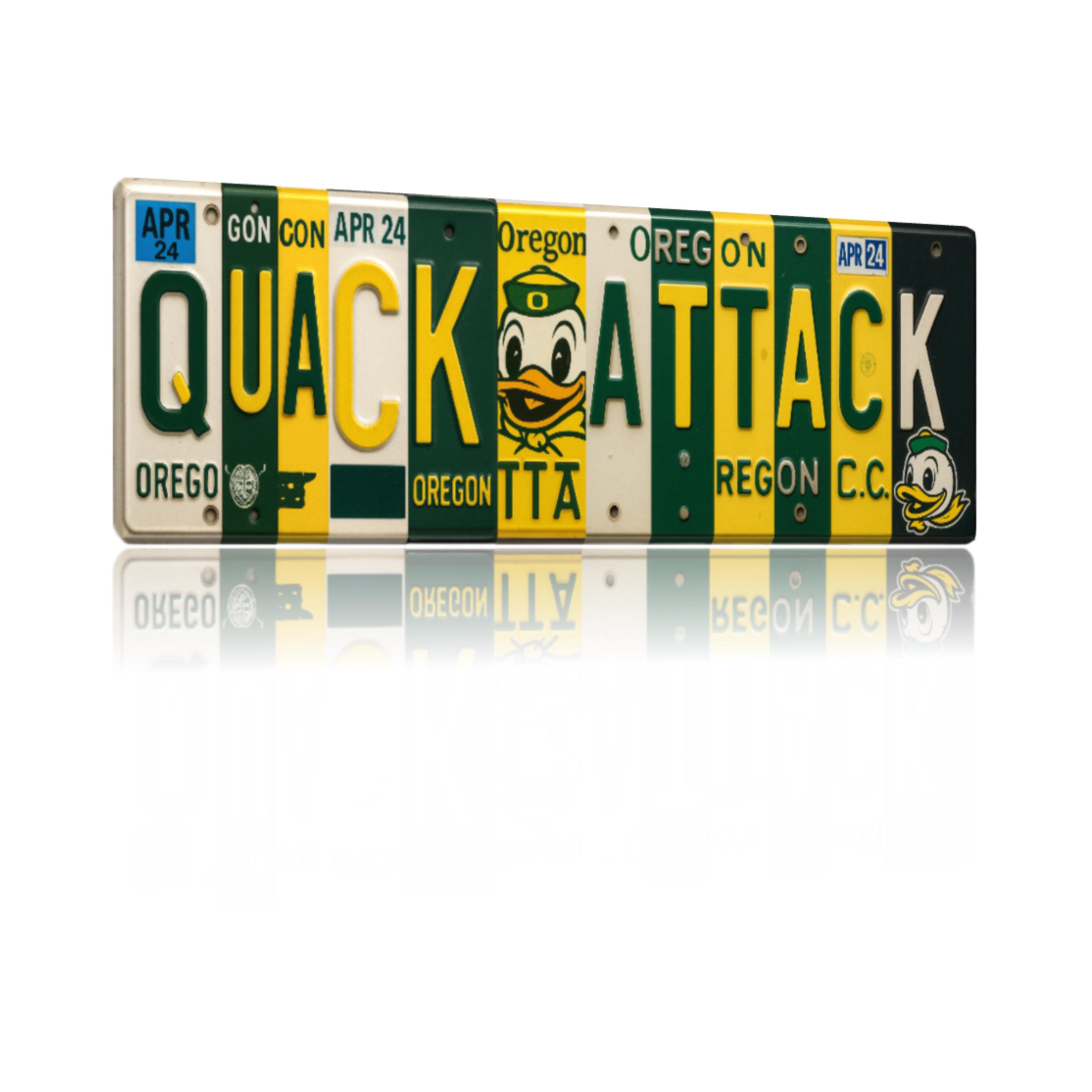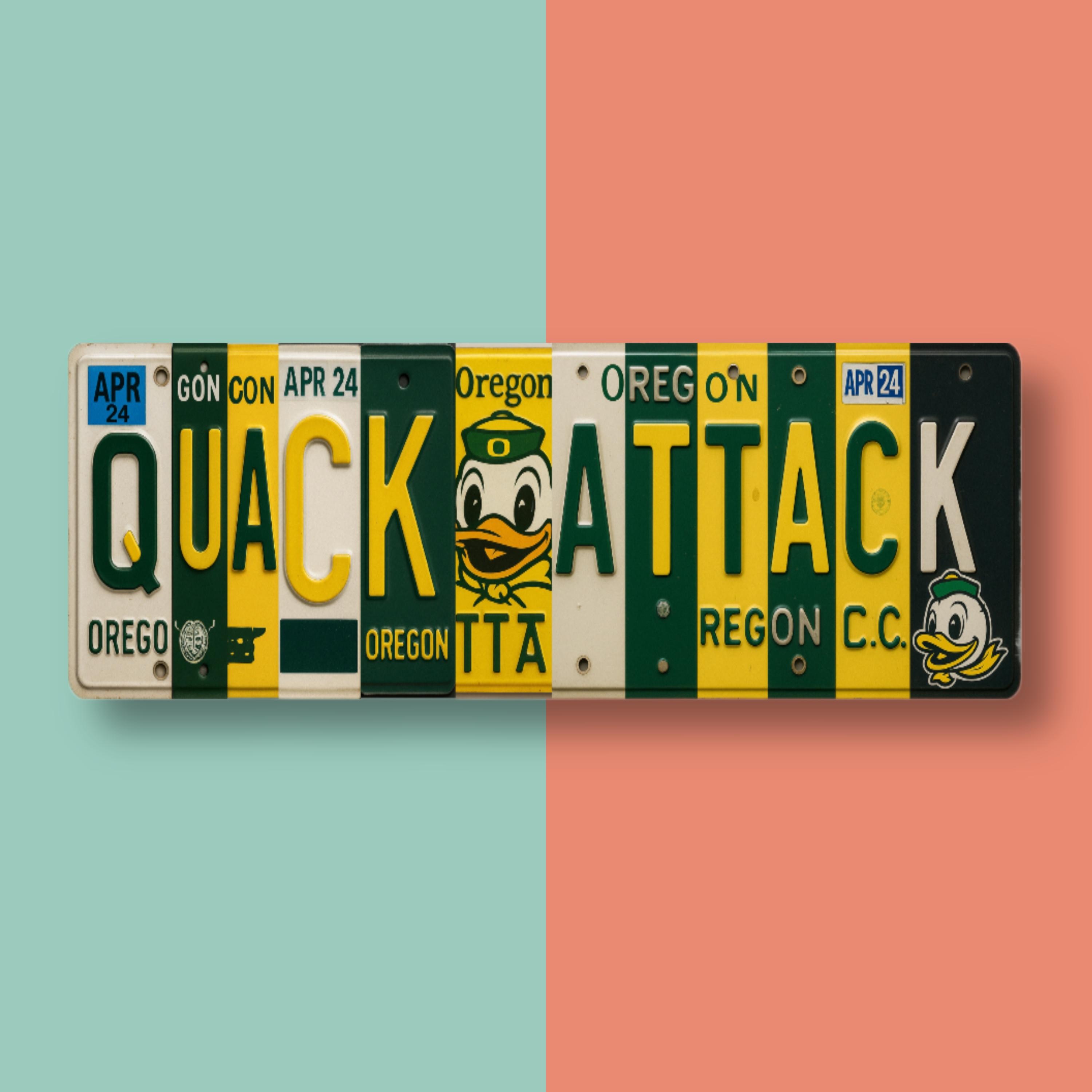 Unleash Duck Nation pride with our “Quack Attack” license‑plate collage sign—a single‑print metal wall art piece designed to mimic real Oregon tags in vibrant green & yellow.