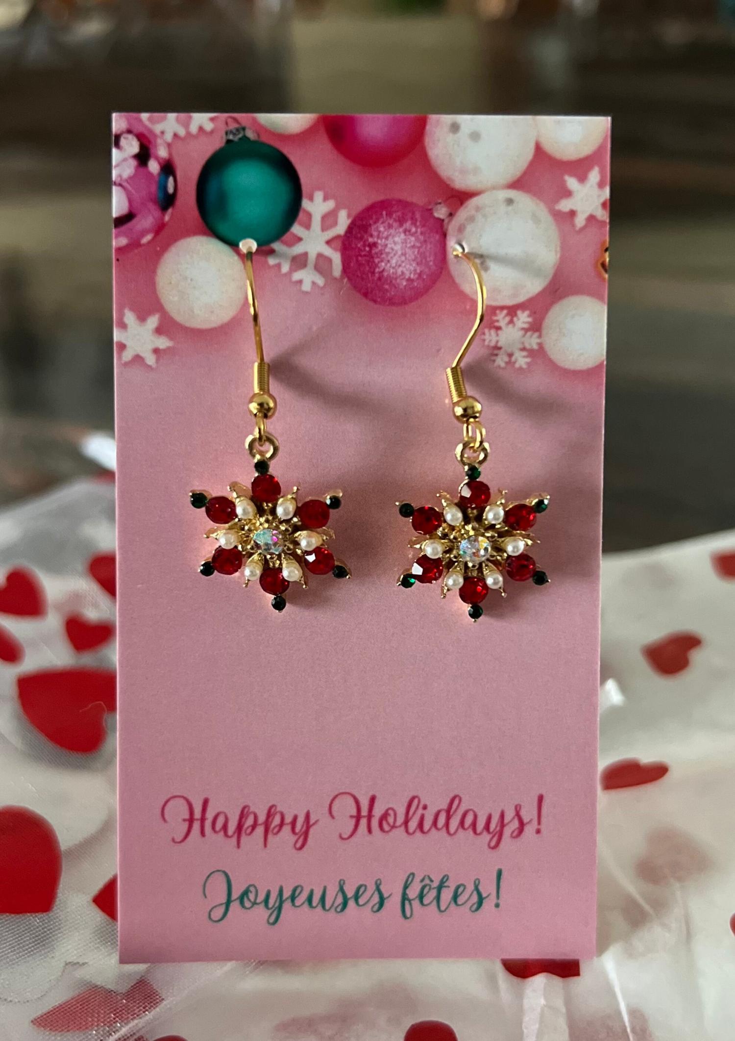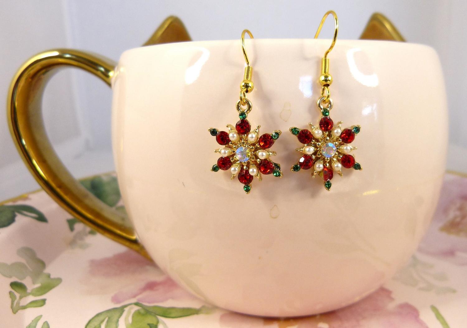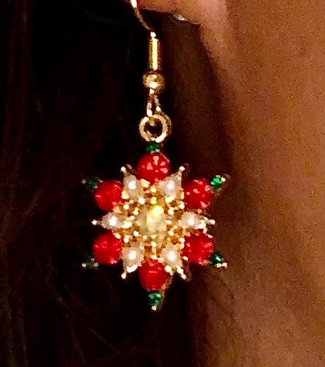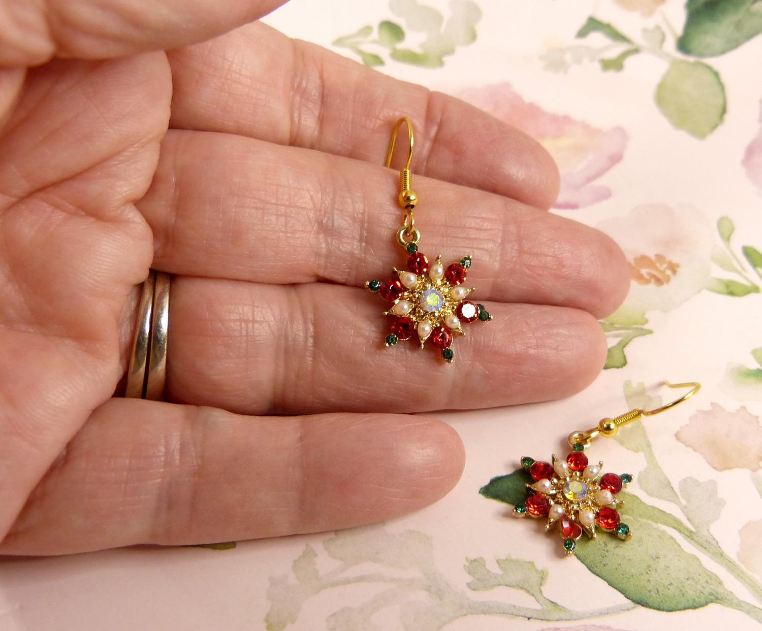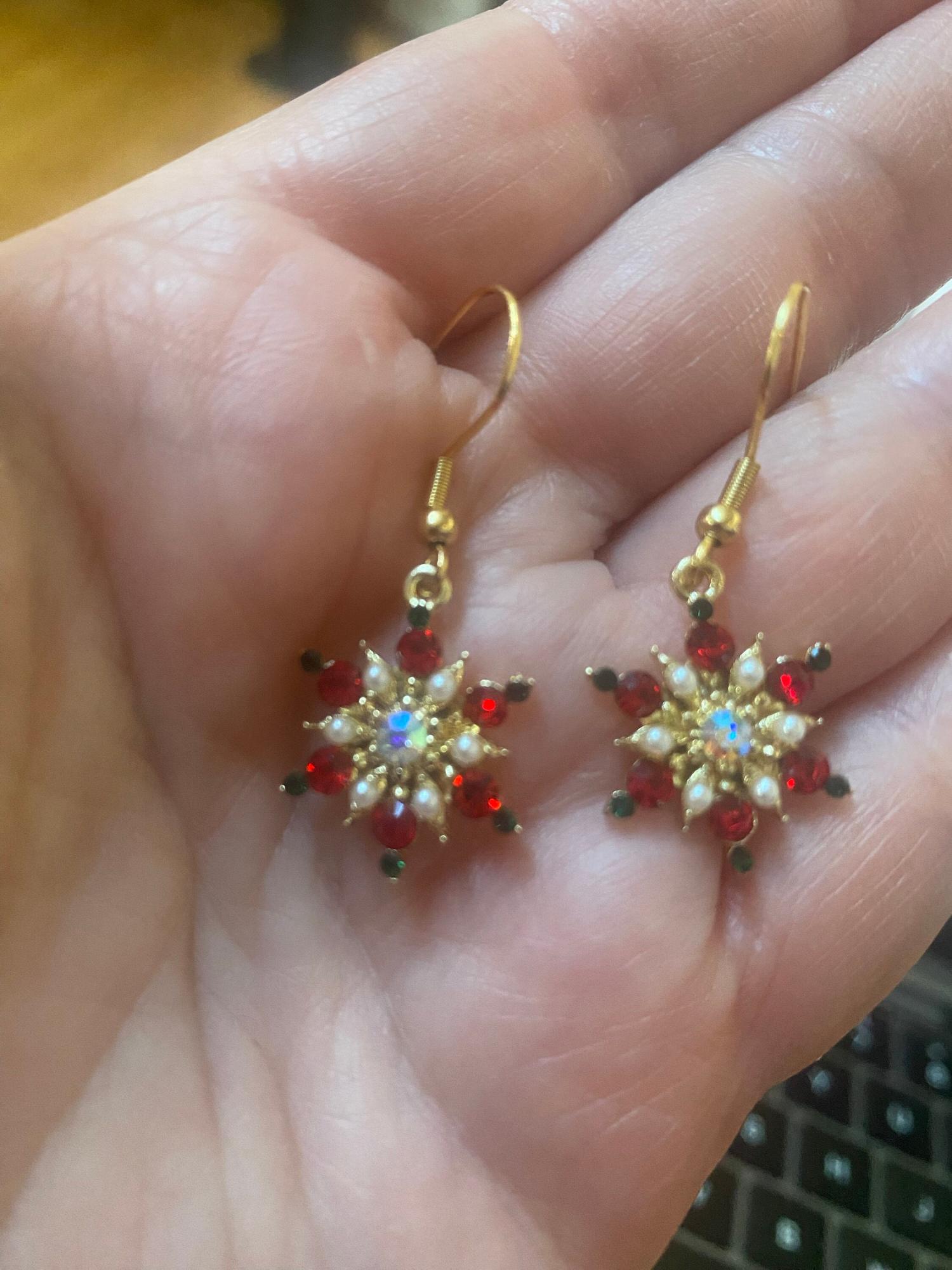 These gorgeous, sparkling Christmas red earrings are adorned with numerous red, green, and milky white crystals, accented with six tiny faux pearls and delicate gold trim. They're breathtakingly beautiful and bursting with festive spirit—perfect for any special occasion during the holiday season! The earrings are small yet not miniature: at just 20mm (0.7 inches) long, they're incredibly lightweight and comfortable to wear—especially since they feature nickel-free, hypoallergenic gold-plated steel hooks. The earrings also come with rubber earplugs to ensure a secure fit! I can't wait to wear these luxurious flower earrings this Christmas!