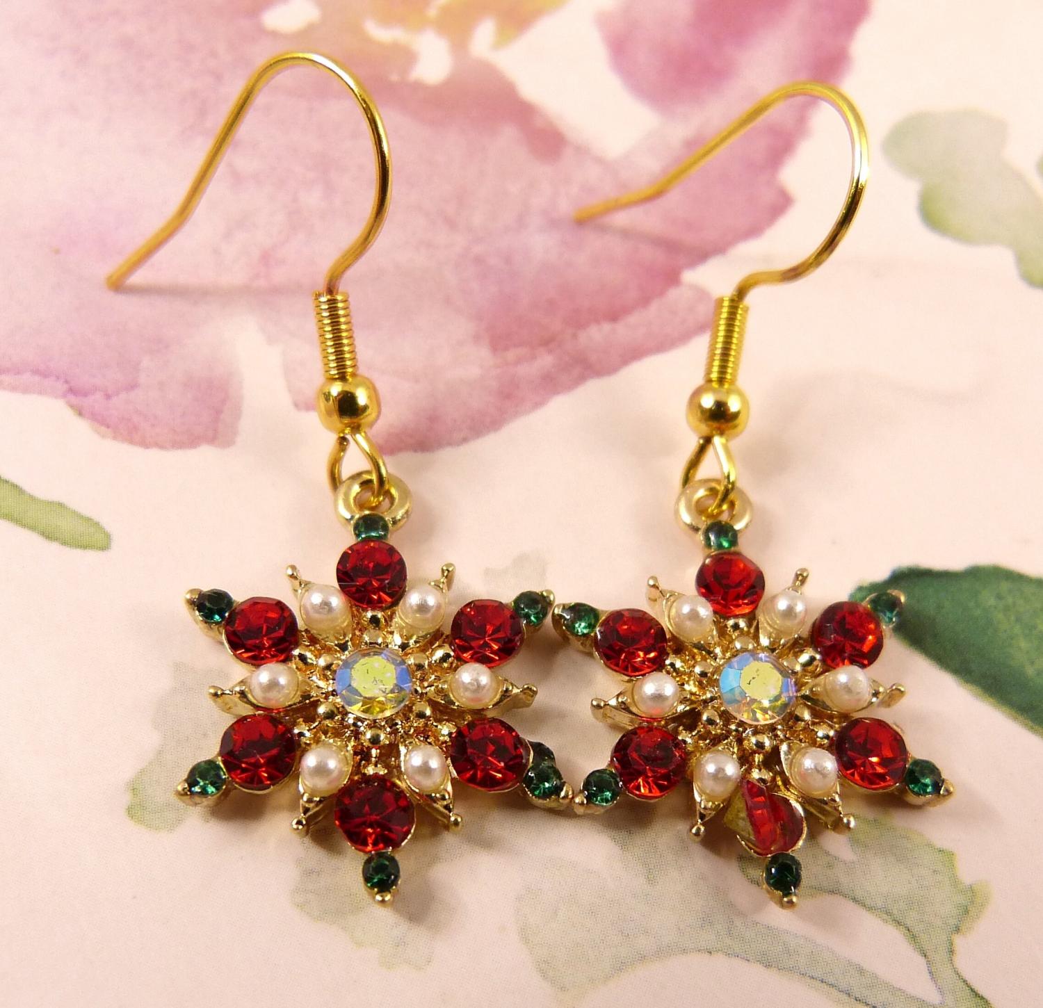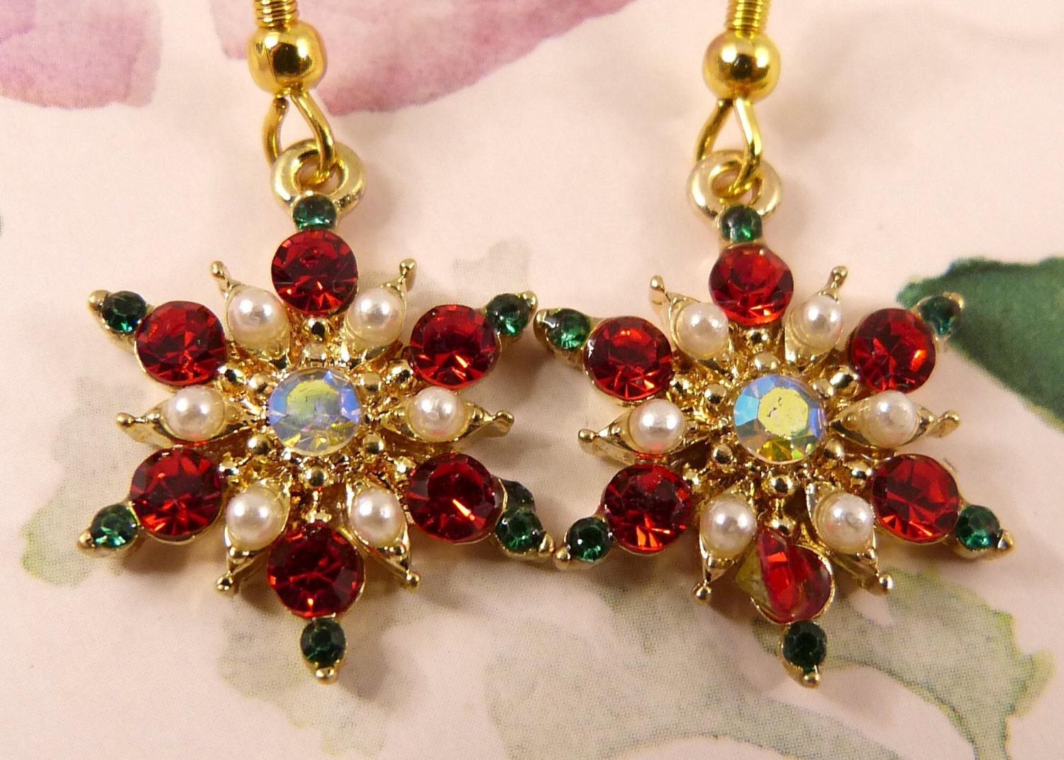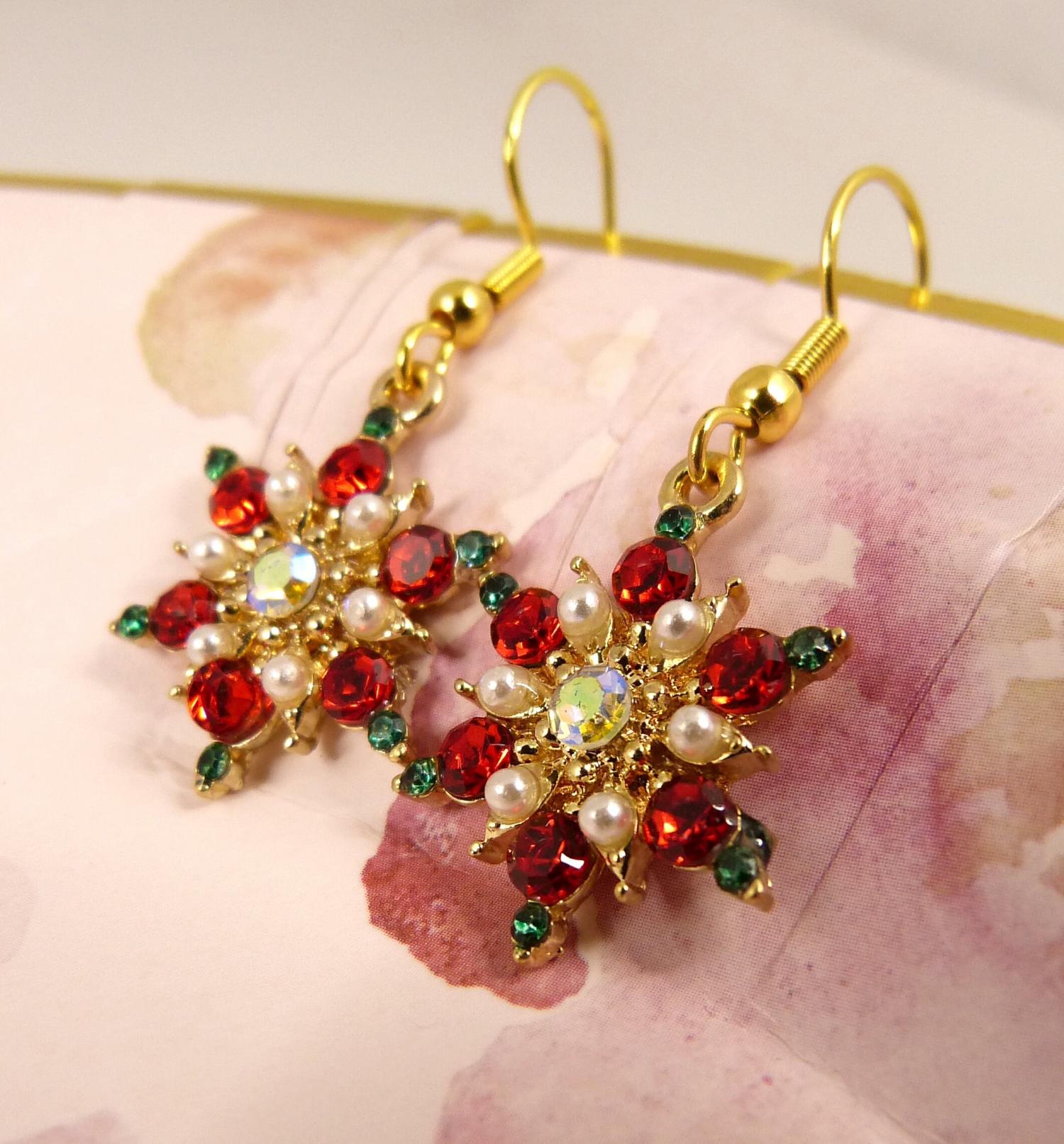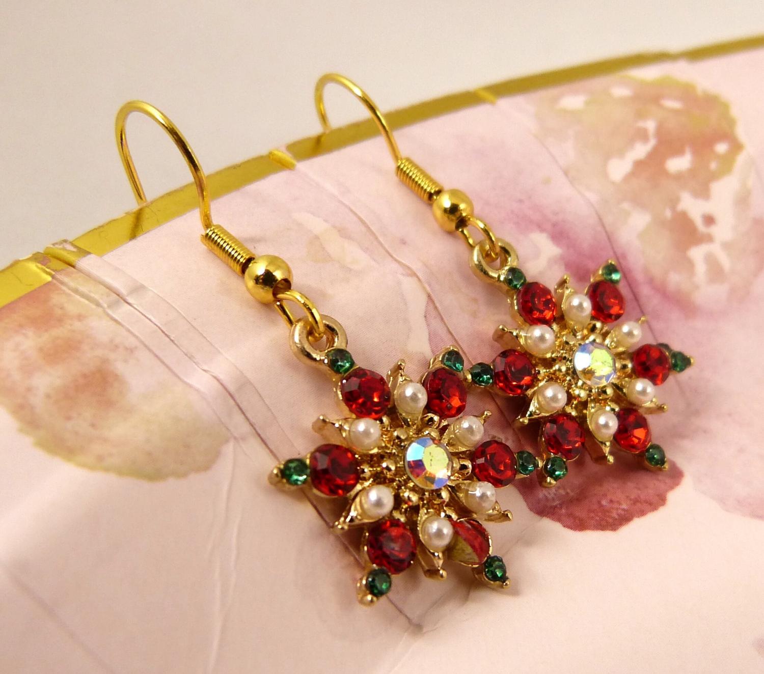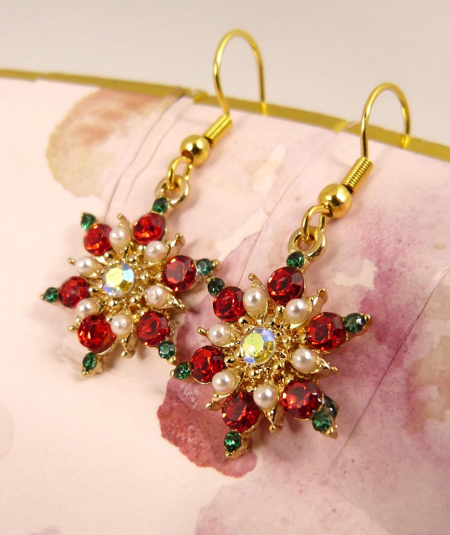 These gorgeous, sparkling Christmas red earrings are adorned with numerous red, green, and milky white crystals, accented with six tiny faux pearls and delicate gold trim. They're breathtakingly beautiful and bursting with festive spirit—perfect for any special occasion during the holiday season! The earrings are small yet not miniature: at just 20mm (0.7 inches) long, they're incredibly lightweight and comfortable to wear—especially since they feature nickel-free, hypoallergenic gold-plated steel hooks. The earrings also come with rubber earplugs to ensure a secure fit! I can't wait to wear these luxurious flower earrings this Christmas!