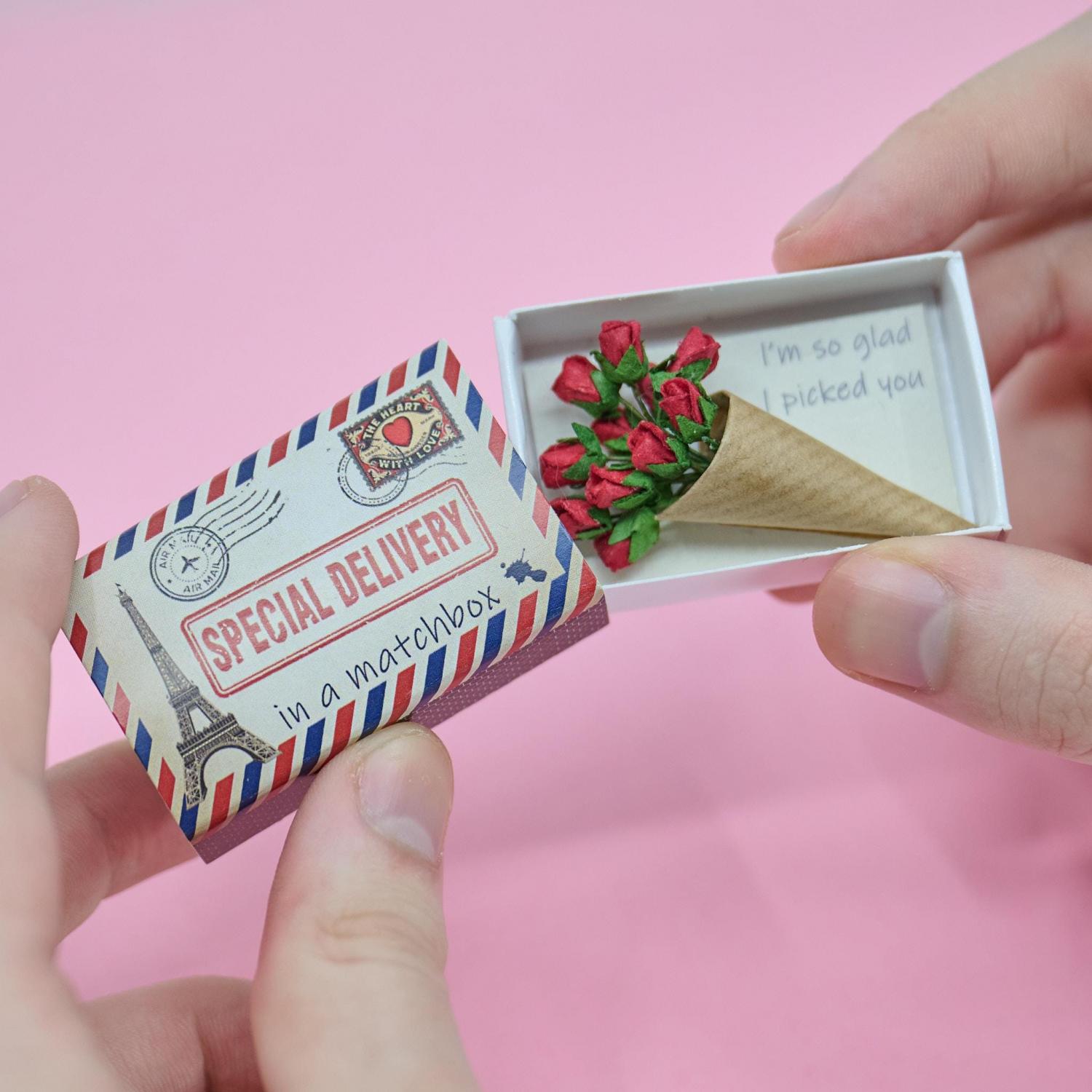 On opening the matchbox the recipient will be presented with an exquisite bunch of handmade paper red roses in a tiny paper bouquet, and the message 'I'm so glad I picked you'.